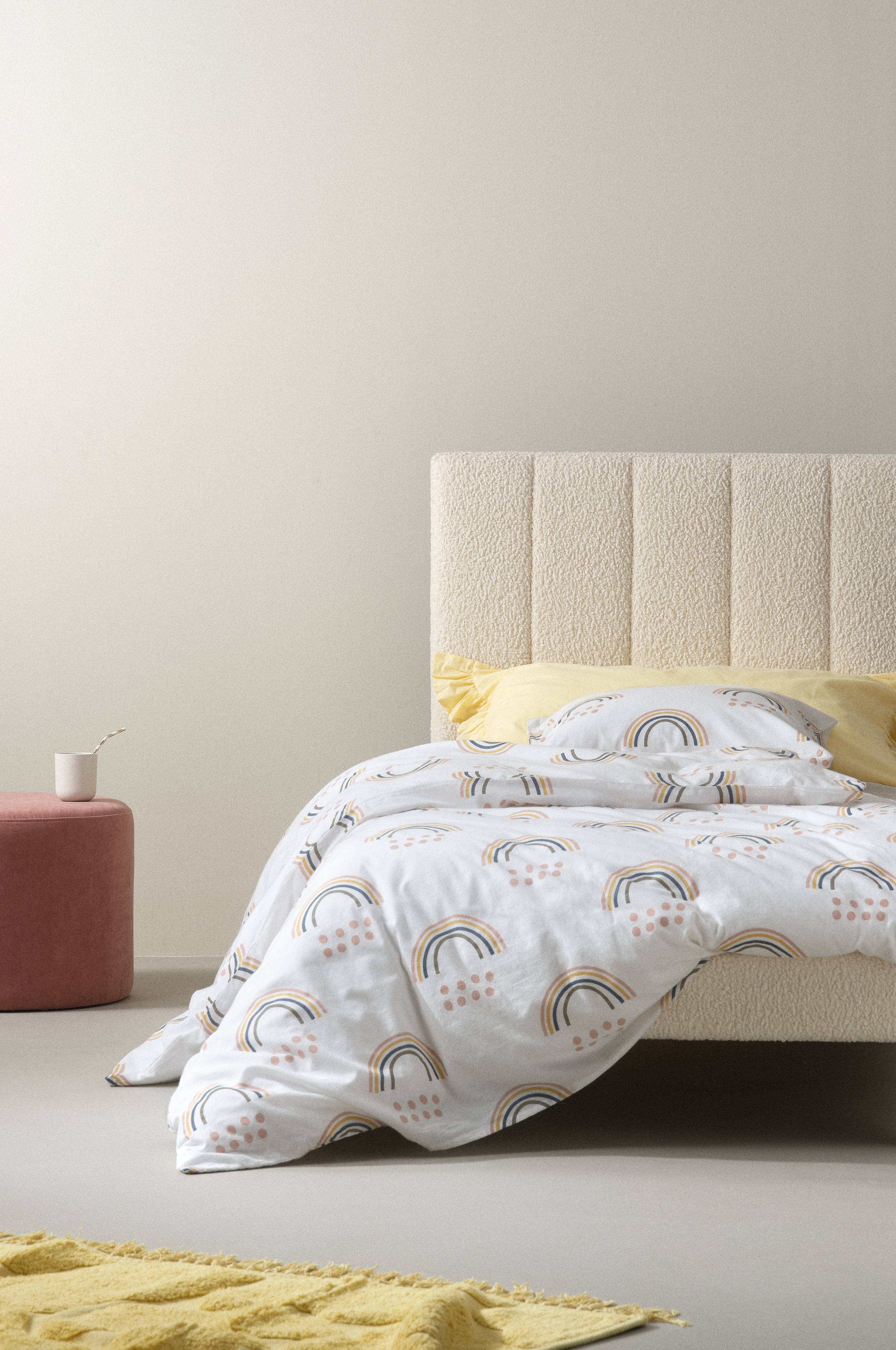 Dynebetræk af økologisk bomuld. ACRO har regnbuemønstre i lyse pasteller printet på en lys baggrund. Økologisk bomuld er skønt at sove i, køligt og blødt mod huden. Sengetøjet i ACRO-serien er stykvasket, hvilket betyder, at de er vasket efter syning, så de er blevet ekstra bløde. Trådtæthed på 144 tc. (Trådtætheden angiver antal tråde, thread count, pr. kvadrattomme i et stof. Jo højere trådtæthed desto højere kvalitet. Dog undtaget hør, der ofte væves løsere for at få det rette udtryk.)