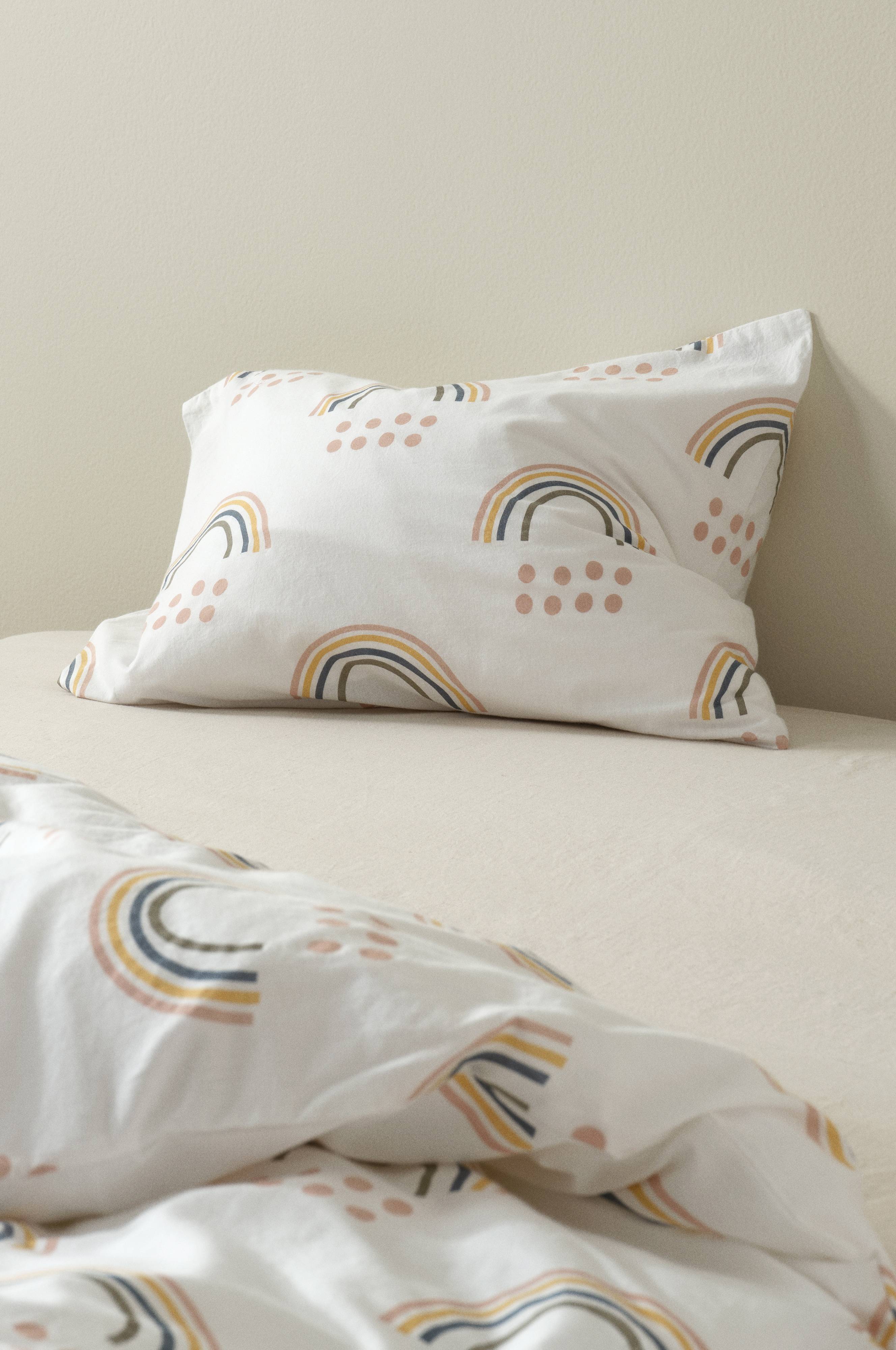 Pudebetræk af økologisk bomuld. ACRO har regnbuemønstre i lyse pasteller printet på en lys baggrund. Økologisk bomuld er skønt at sove i, køligt og blødt mod huden. Sengetøjet i ACRO-serien er stykvasket, hvilket betyder, at de er vasket efter syning, så de er blevet ekstra bløde. Trådtæthed på 144 tc. (Trådtætheden angiver antal tråde, thread count, pr. kvadrattomme i et stof. Jo højere trådtæthed desto højere kvalitet. Dog undtaget hør, der ofte væves løsere for at få det rette udtryk.)