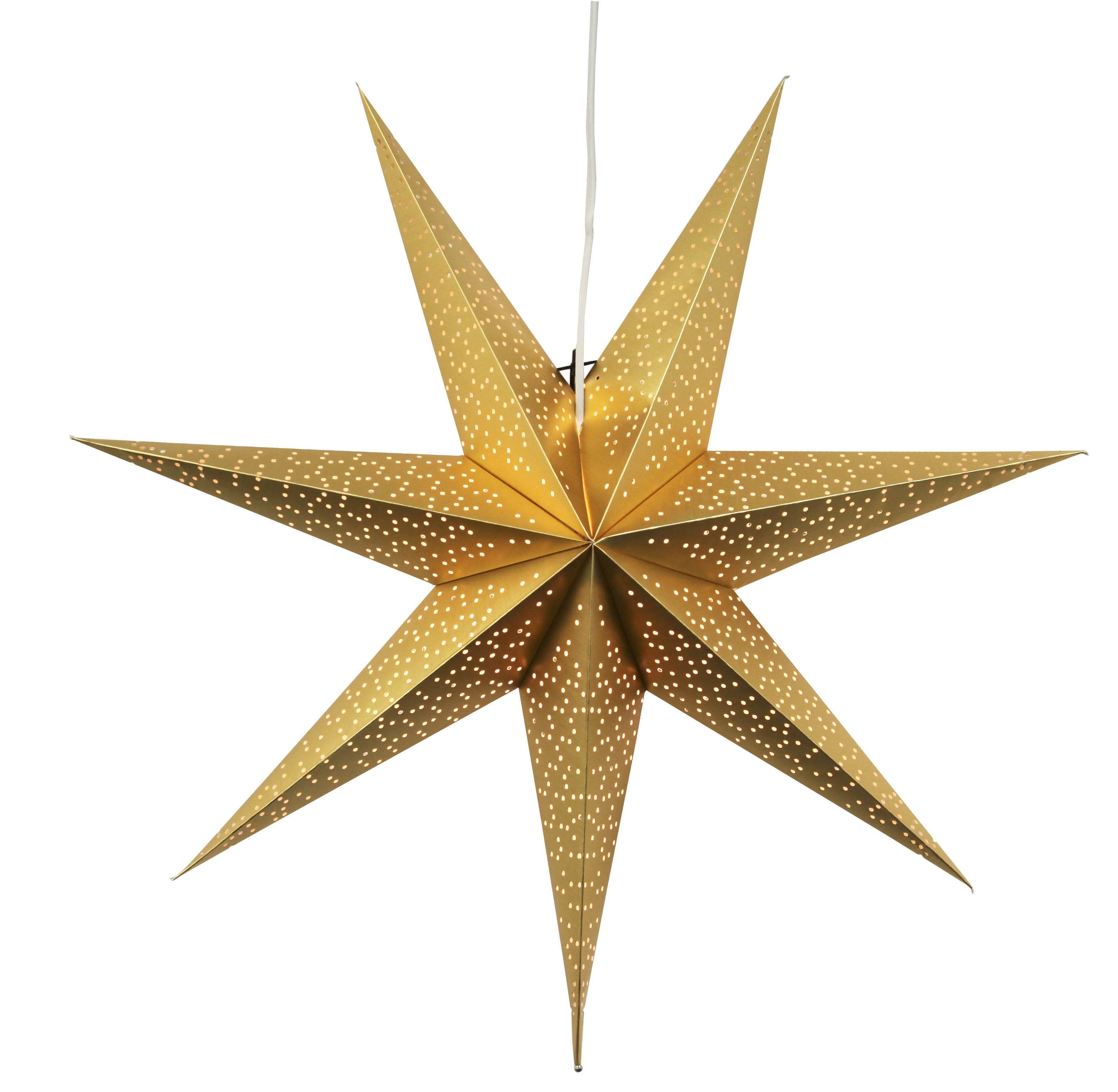 Hængende stjerne af guldfarvet papir. Højde 70 cm. Dybde 16 cm. Bredde 70 cm. Tilslutningskabel 3,5 m. E14 sokkel. Lyskilde medfølger ikke.