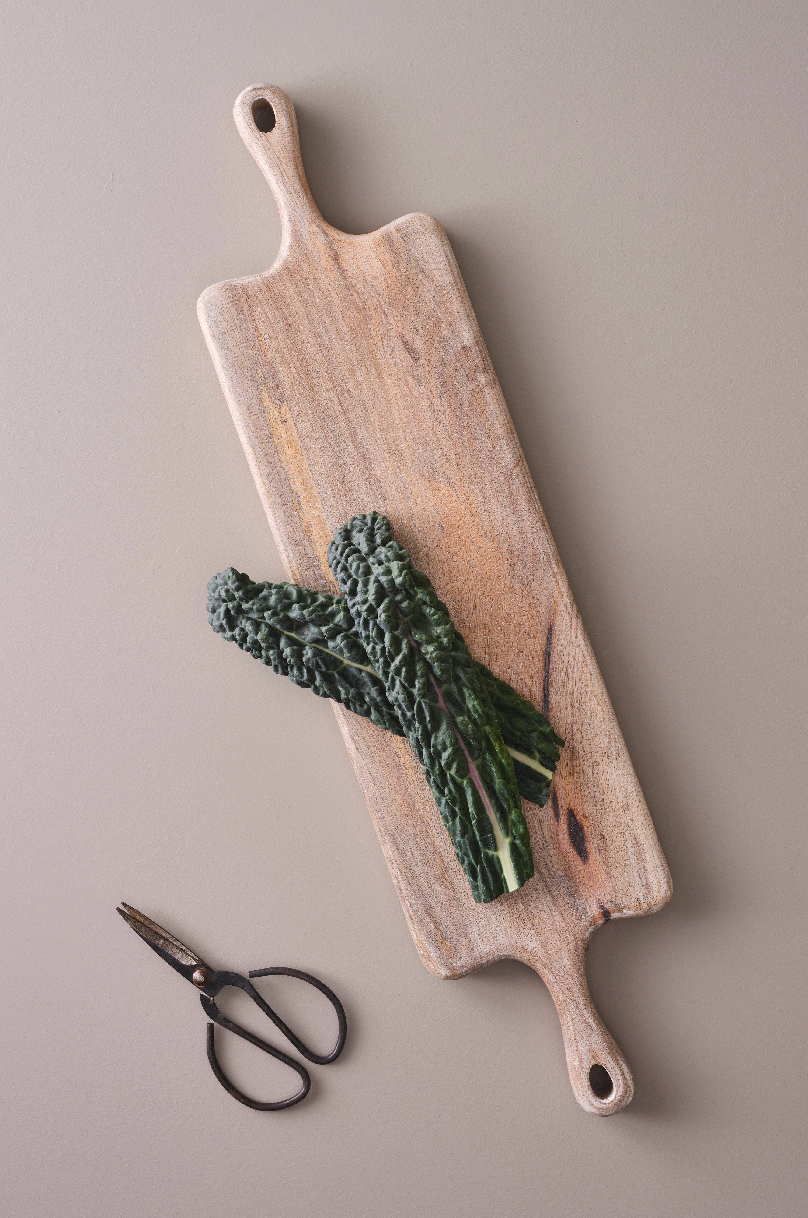 Skærebræt af FSC-certificeret mangotræ med smuk åretegning. Skærebrættet har hvidpigmenteret overflade, som gør det lyst og flot. Den specielle form med to håndtag betyder at den velegnet på middagsbordet med brød eller grøntsager fint anrettet. Skærebrættet har behageligt afrundede kanter og hvert skærebræt er unikt, da træ har naturlige variationer.