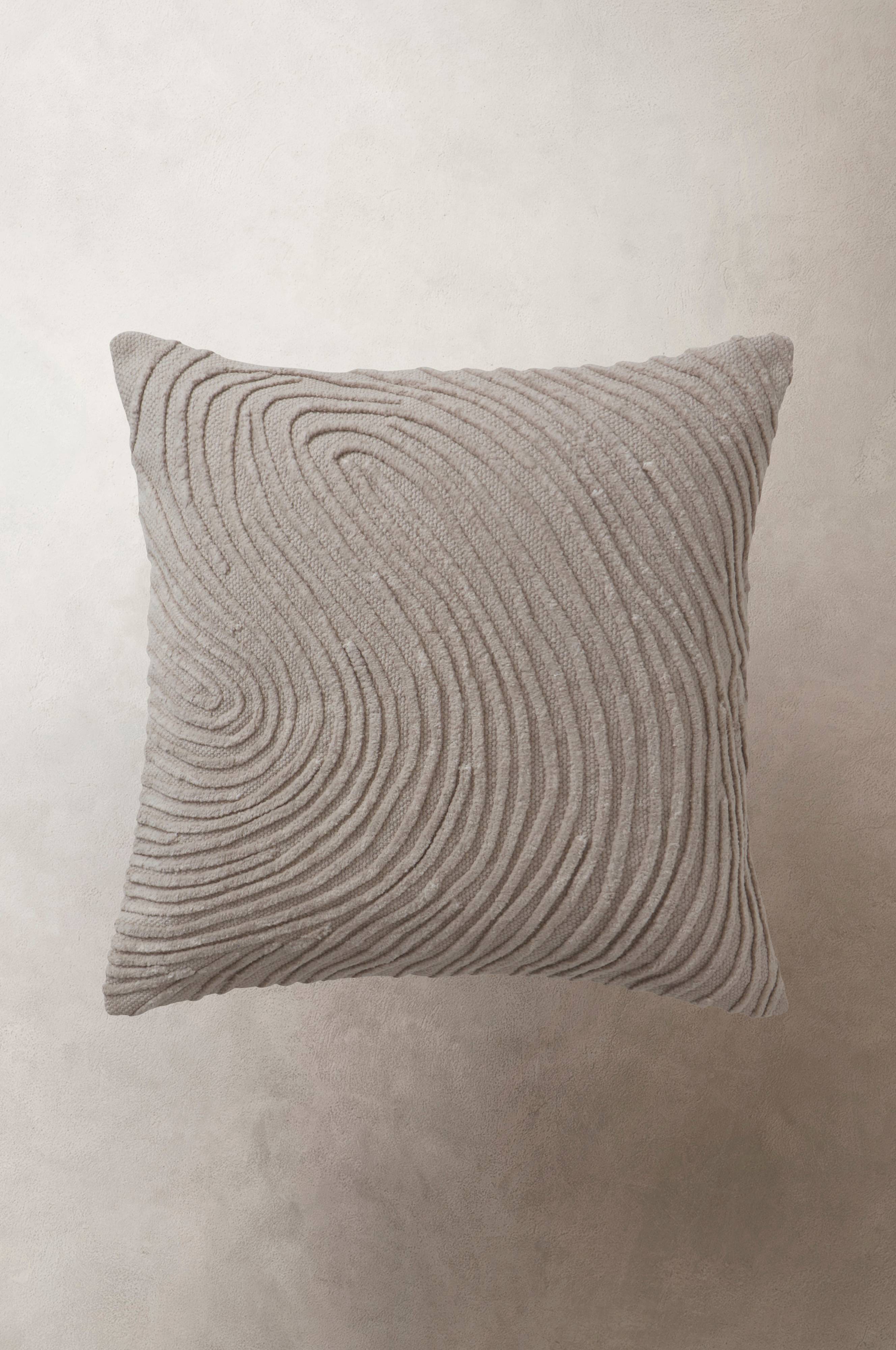 1-pak pudebetræk med bølgemønster, der er maskinbroderet på et lidt grovere stof. Forsiden er foret. Pudebetrækket har vævet, offwhite bagside med skjult lynlås.