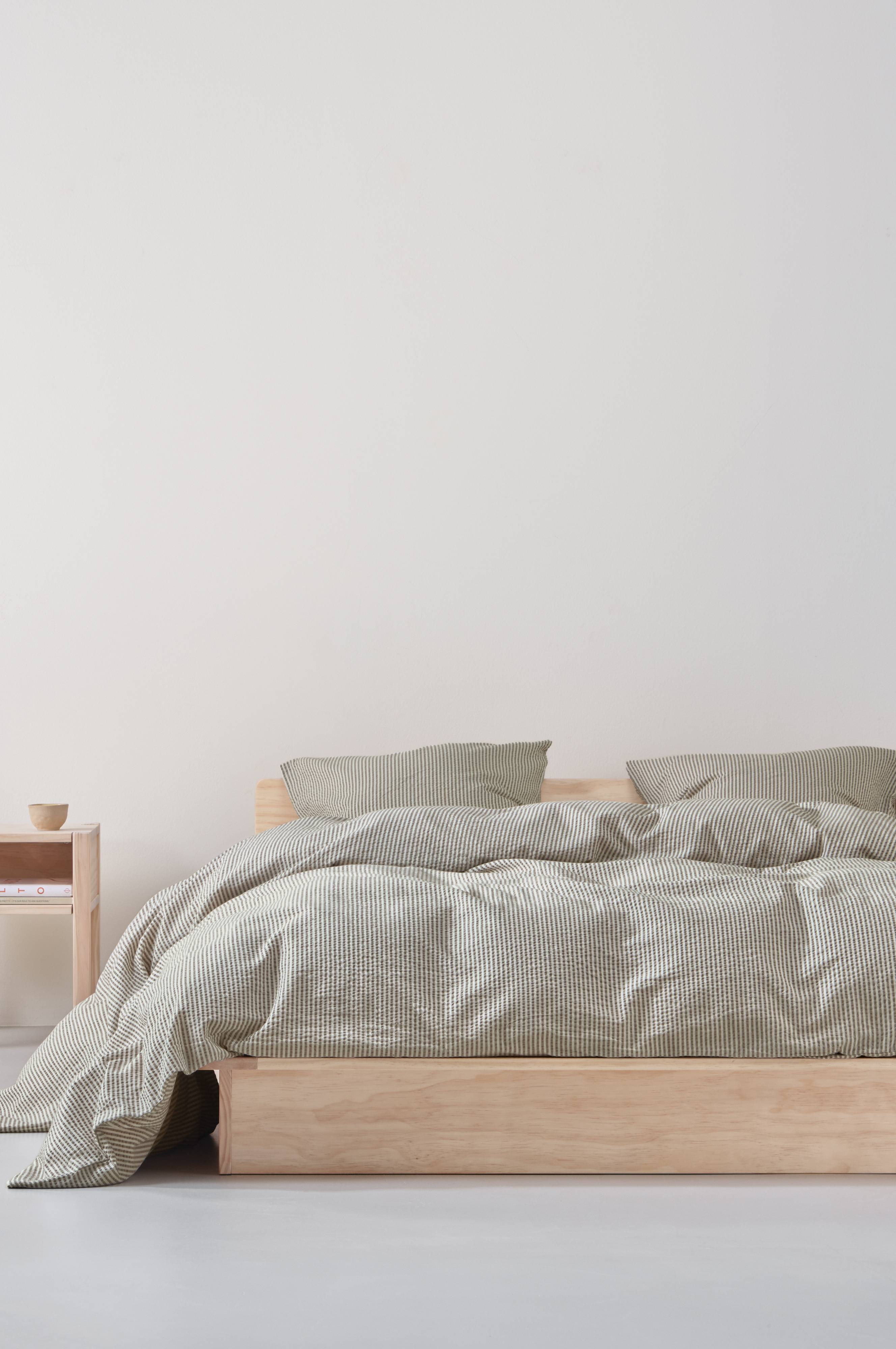 ALMA DYNEBETRÆKSÆTTET er lavet af blød bækkenbølge med elegante garnfarvede striber, der tilføjer et romantisk touch til dit soveværelse. Sættet har knaplukning og et ekstra bredt dynebetræk og to matchende pudebetræk. Som en del af ALMA-familien forstærker dette sæt en sammenhængende æstetik med yderligere matchende elementer, der blander både komfort og stil for dem, der værdsætter en romantisk atmosfære i deres hjem.