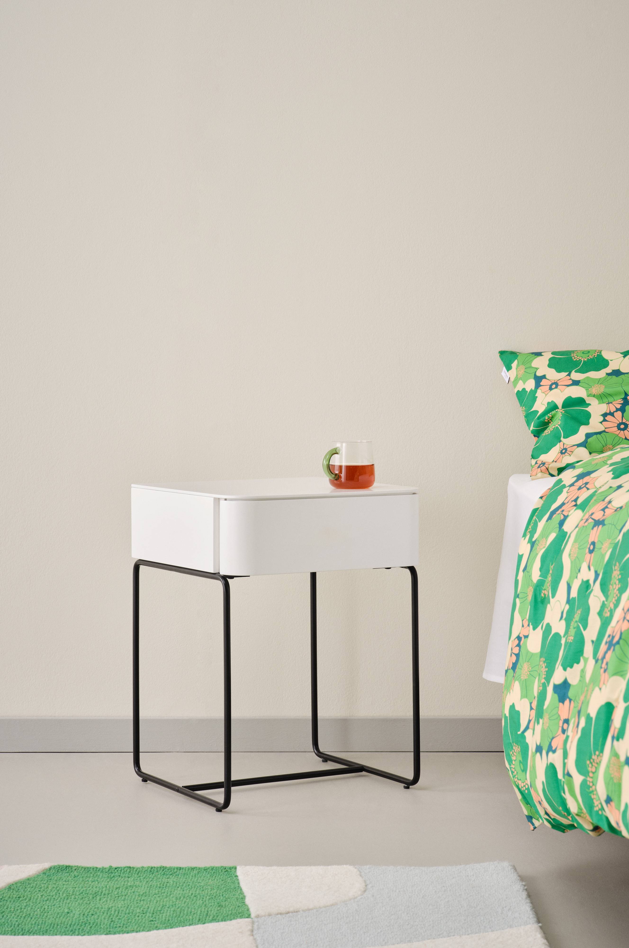 Sengebord fremstillet af elegant MDF og understøttet af robuste jernben med en elegant pulverlakeret finish. Dette alsidige møbel har en enkelt skuffe, der er perfekt til at holde de vigtigste ting inden for rækkevidde om natten. Det moderne design er ideelt til både soveværelse og stue og passer til en bred vifte af indretningsstile. Dens minimalistiske æstetik og funktionelle opbevaring gør den til en værdifuld tilføjelse til ethvert moderne hjem.