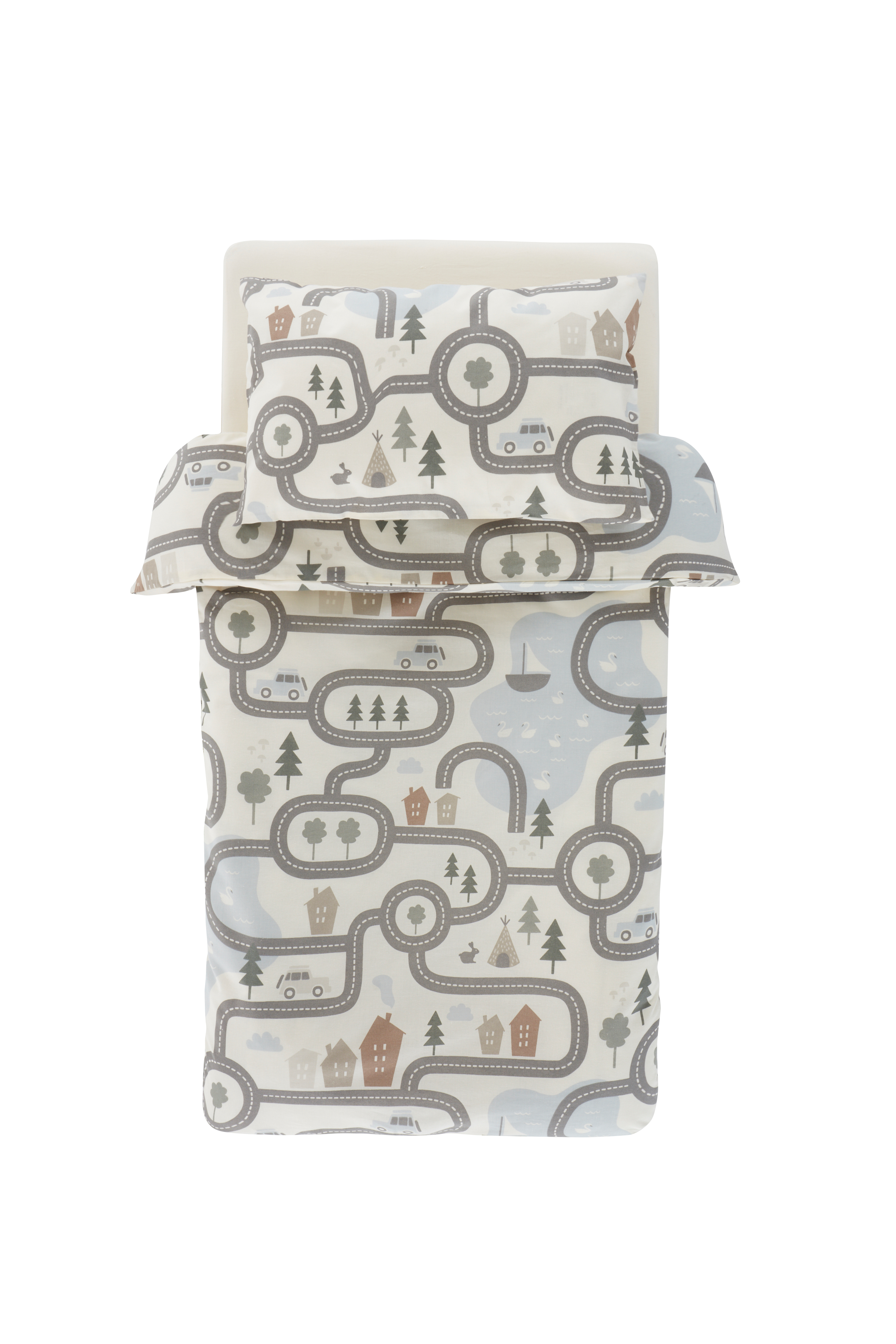 Sæt med dynebetræk, pudebetræk og faconsyet lagen i økologisk bomuld. Dynebetræk og pudebetræk har mønsterprint i milde, harmoniske farver. Motivet er en myldrende by med veje, huse, dyr og natur. Det faconsyede lagen er ensfarvet i en matchende cremehvid farve. Elastik i hjørnerne gør at det faconsyede lagen sidder godt på madrassen. Sengesættet passer til tremmeseng. Økologisk bomuld er skønt at sove i, køligt og blødt mod huden. Trådtæthed på 144 tc. (Trådtætheden angiver antal tråde, Thread Count, pr. kvadrattomme i et stof. Jo højere trådtæthed desto højere kvalitet.)