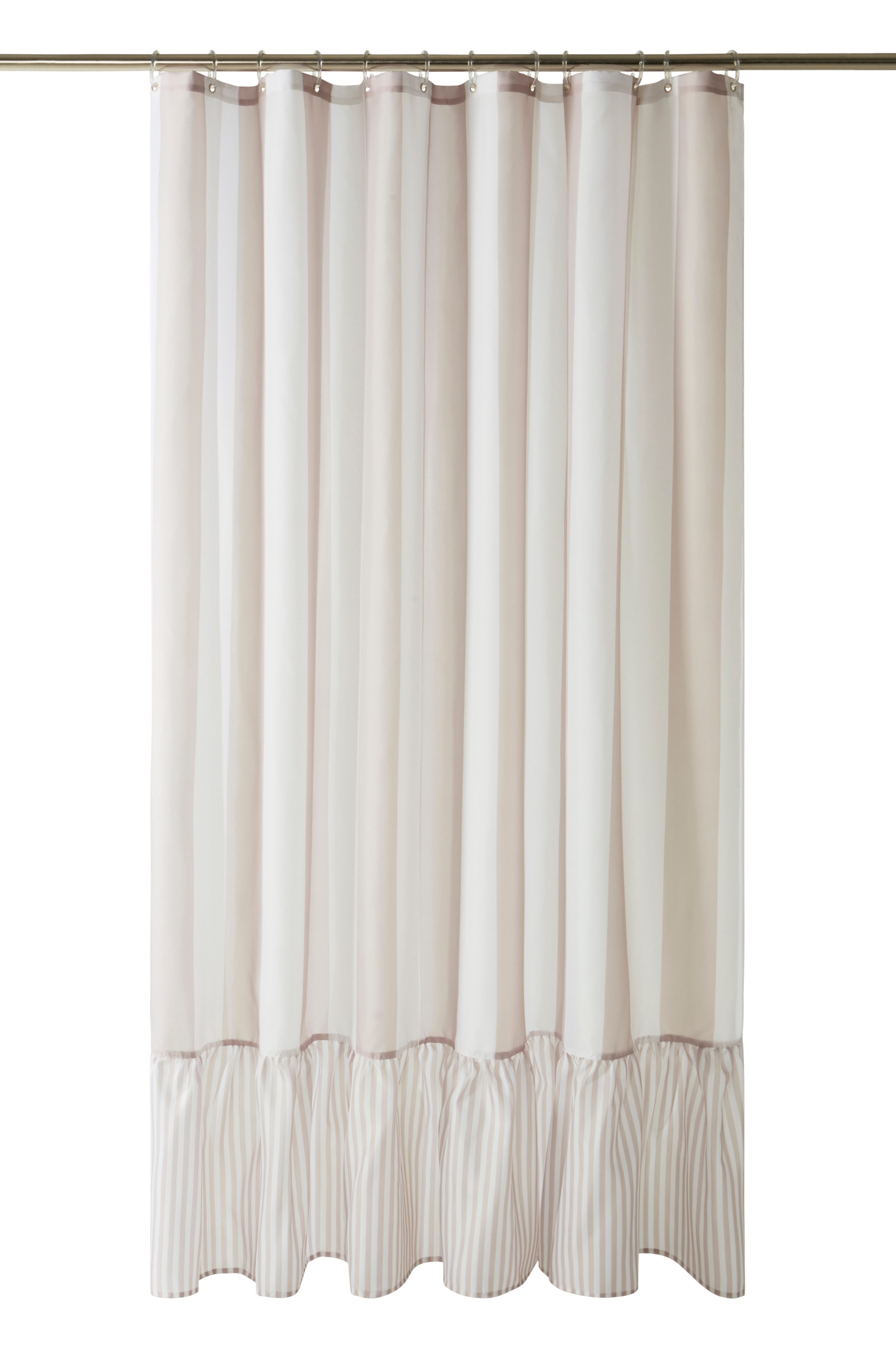 ANDREA er et badeforhæng med flæser og digitaltrykte striber. Det digitale print giver et karakteristisk mønster. Bruseforhænget har tolv matte øjer fremstillet af rustbestandigt kobber. Polyesterstoffet har en vandafvisende behandling. Det klassiske stribede design kombineret med fine flæser giver et unikt look til dit badeværelse.