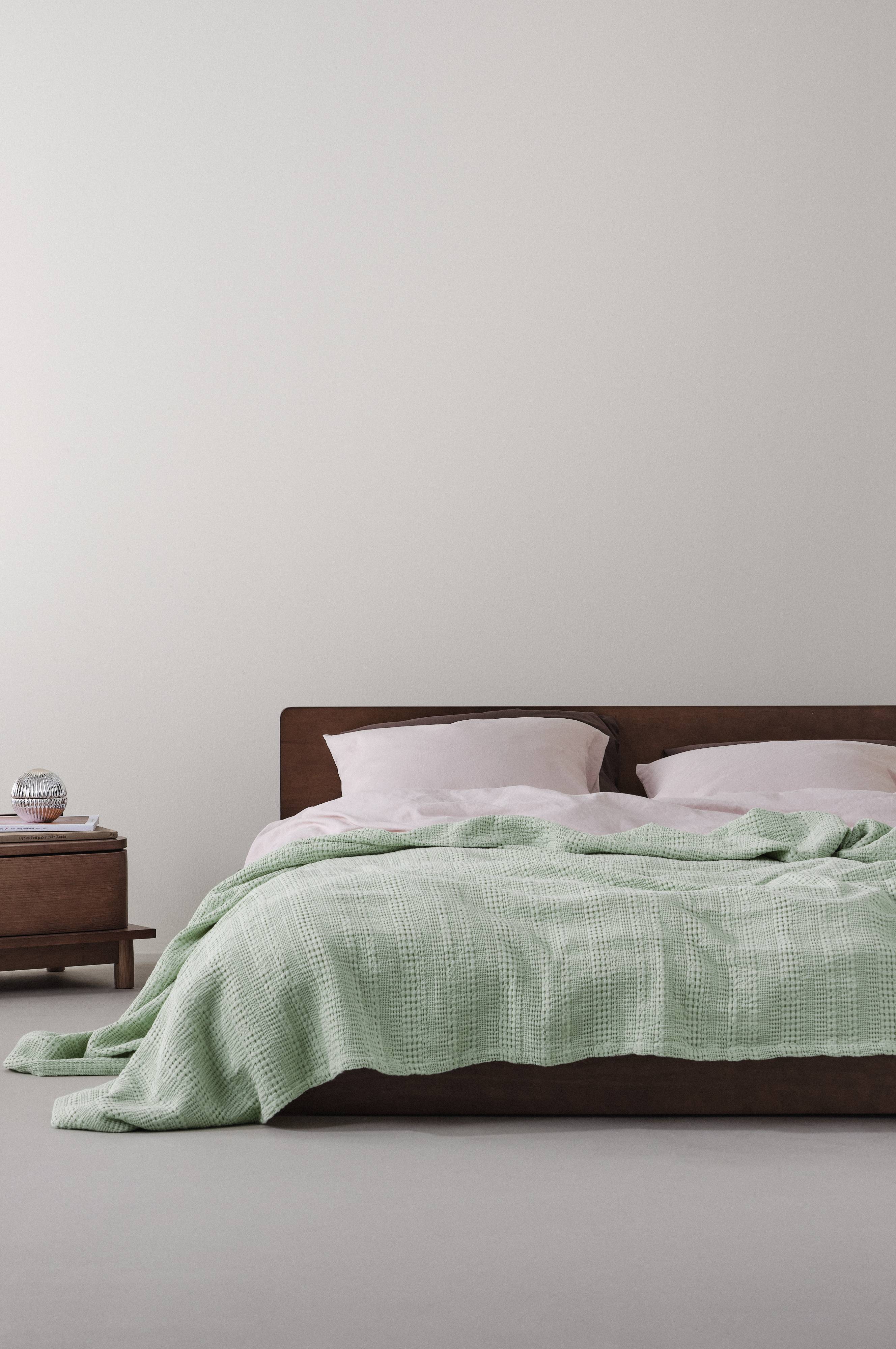 Sengetæppe i skønt blød og let bomuld med blandet vaffelmønster som giver fine striber. Sengetæppet passer til en enkeltseng og er tøjvasket, hvilket betyder, at det er vasket efter syning for at blive ekstra blødt og smidigt. Et livligt sengetæppe med boblet struktur er lige så rart, når sengen er redt, som når det ligger løst og frit over sengens fodende eller kan være en plaid på sofaens armlæn.