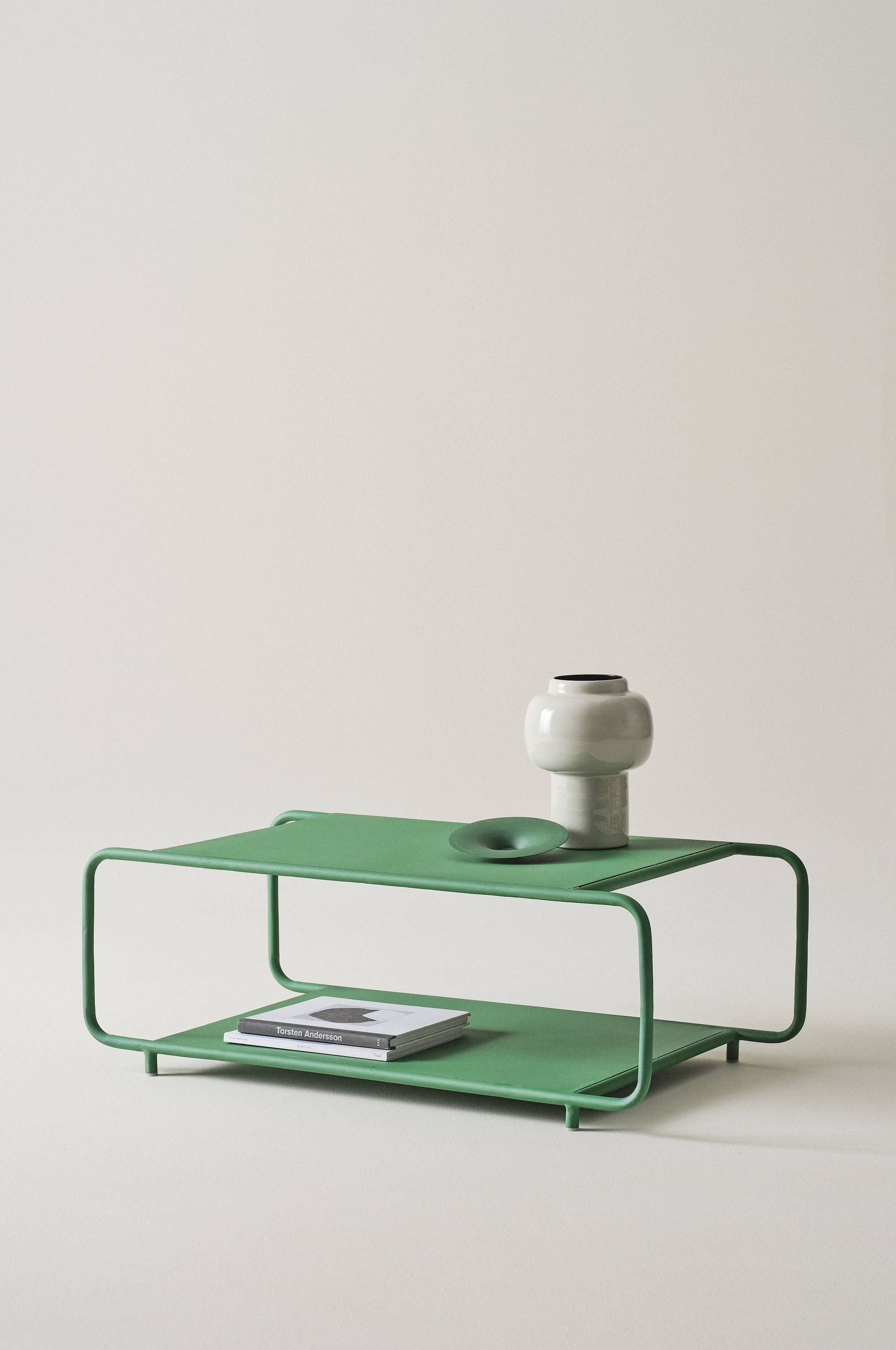 Rektangulært sofabord af pulverlakeret jern. Bordet har et kækt design med et afrundet stel af jernrør, som stikker ud over bordpladen på de korte sider. Hylden under bordpladen har fint plads til for eksempel magasiner og fjernbetjeninger. Skal færdigsamles. Samlevejledning medfølger.