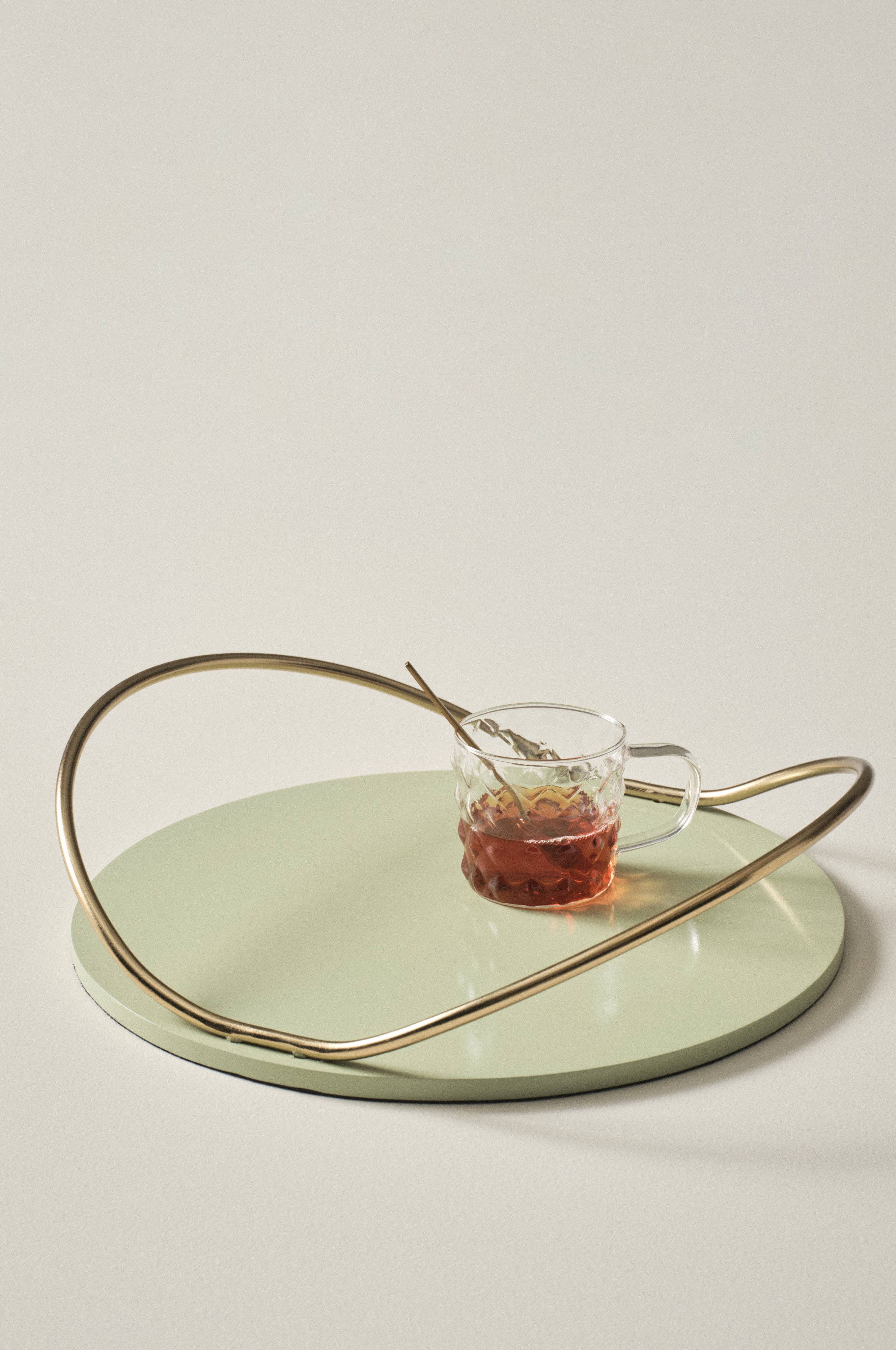 Rund bakke af MDF med bølgende håndtag af messingfarvet jern. AURELIA er en bakke som giver opdækningen stil og vækker opmærksomhed når du serverer f.eks. velkomstdrinks på den.