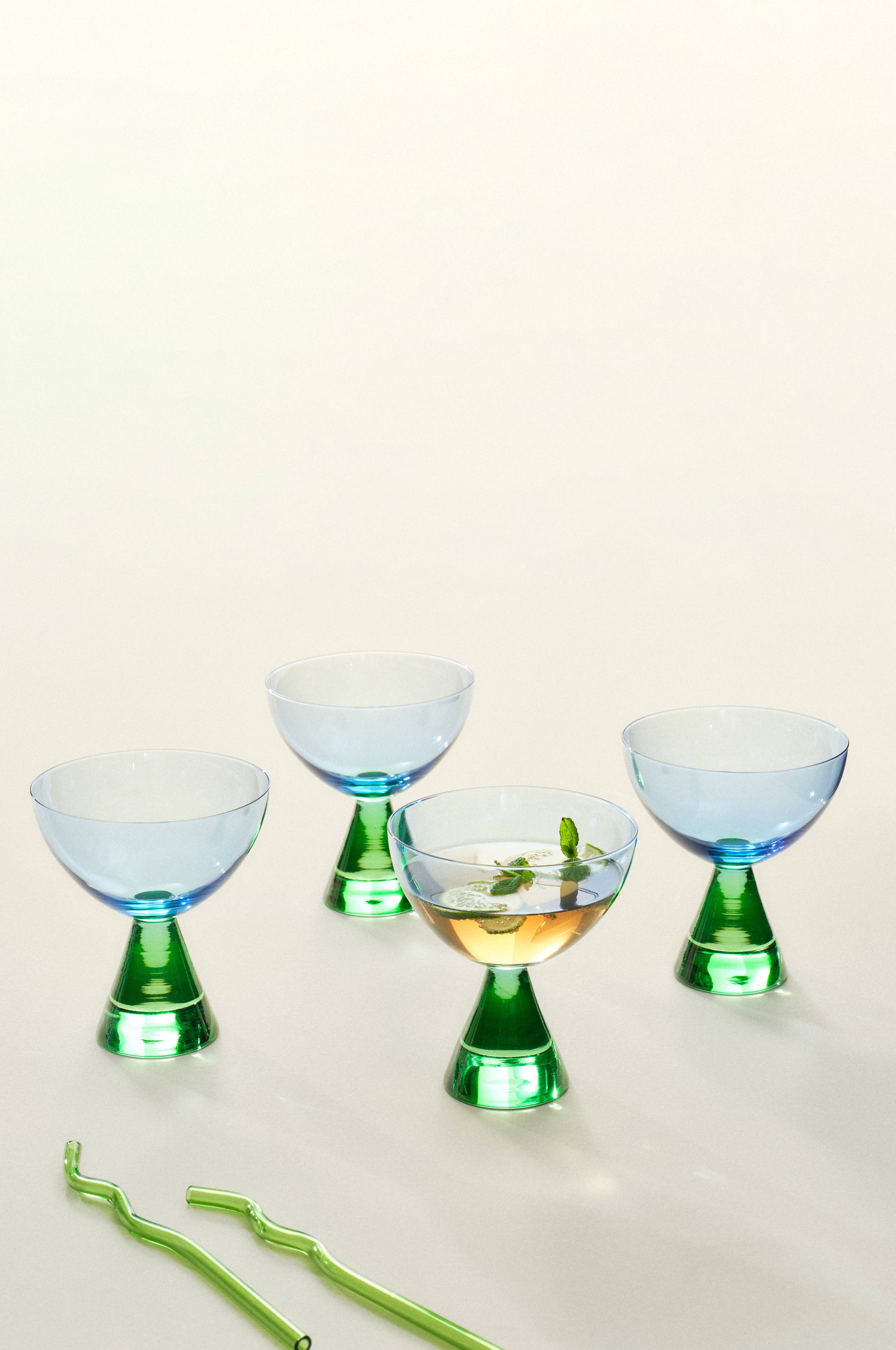 4-pak cocktailglas på fod. Det lækre glas AYLA kommer i to sommerlige farvekombinationer og formen er tiltalende. Både boblende drinks og cocktails smager forfriskende godt i et glas som dette, og borddækningen får et skønt look. Til sommerens garden party er AYLA et must.