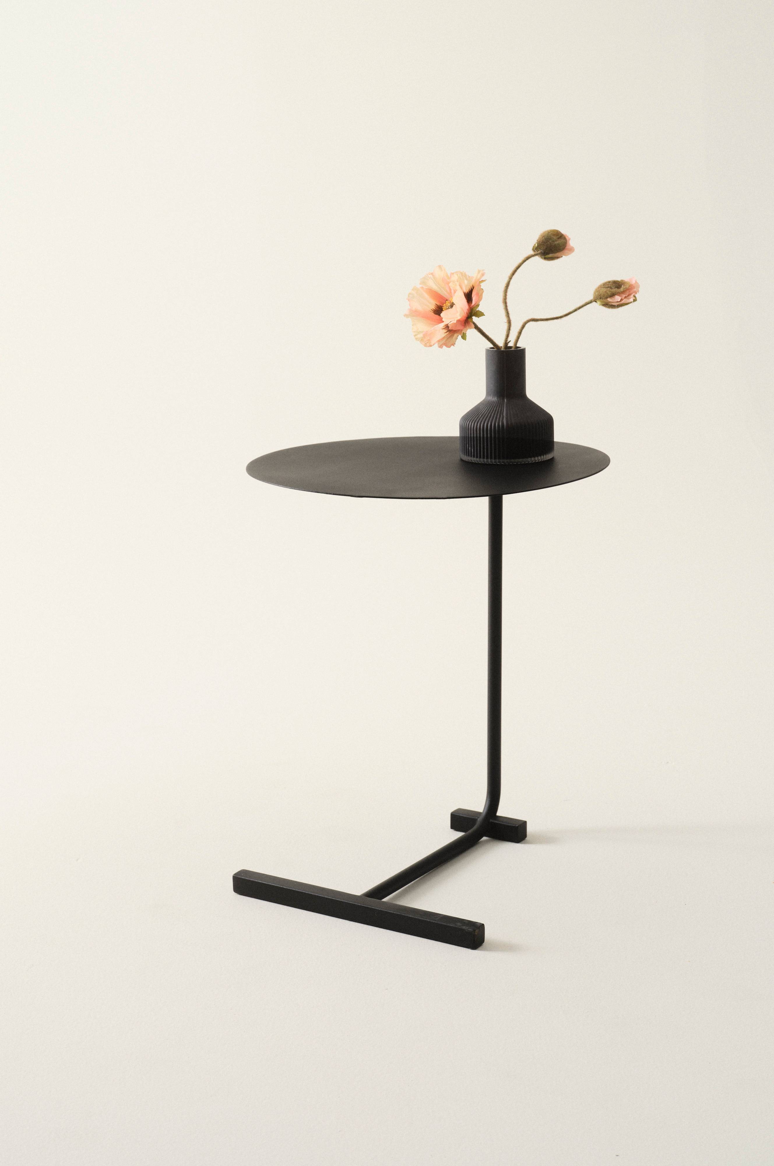BALZERS er et sidebord i jern med et fint understel og en rund, tynd bordplade. Overfladen er pulverlakeret og har let struktur. Bordet har et unikt L-formet understel.