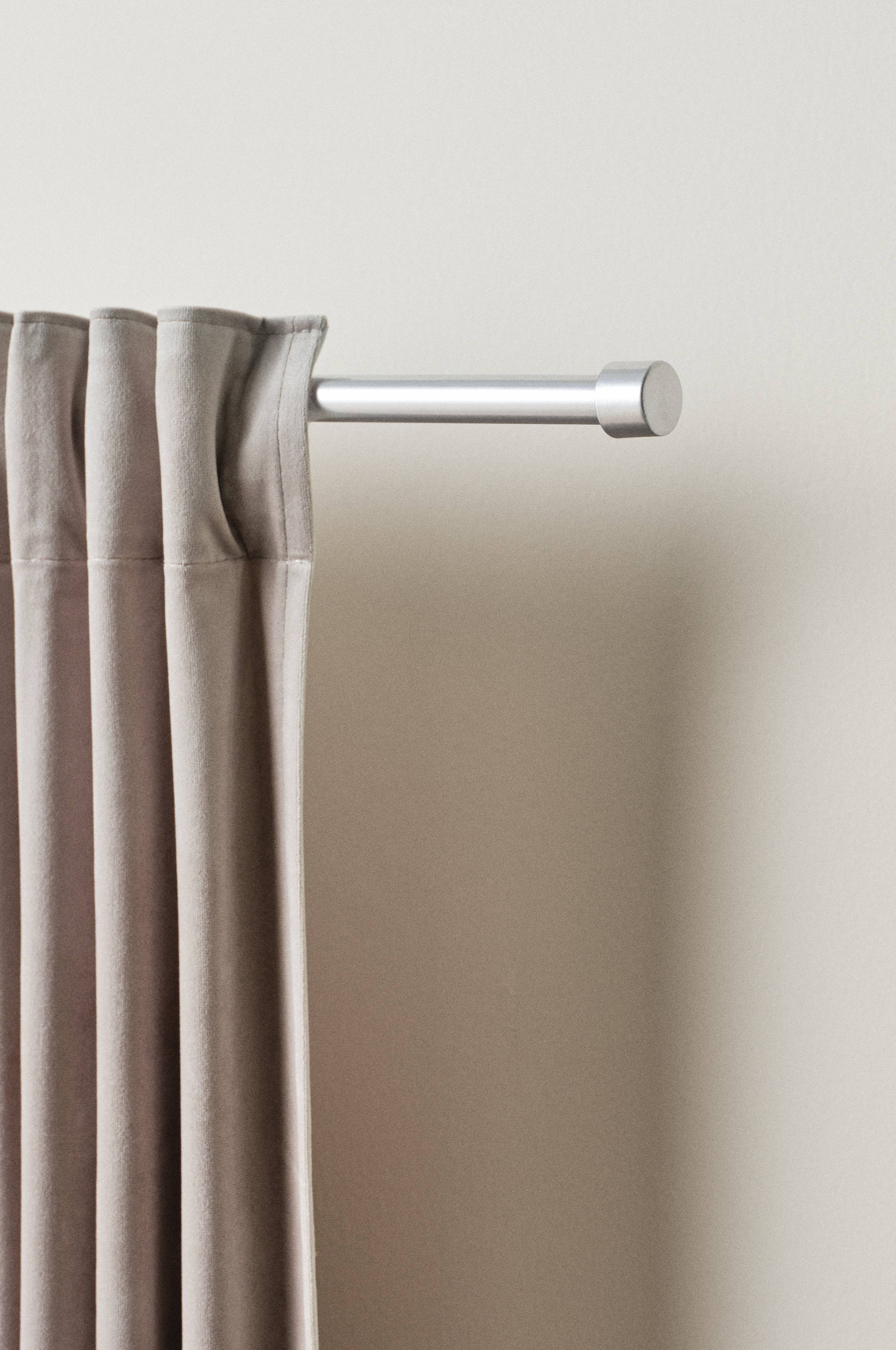 Gardinstang af aluminium og endeknopper af metal. Vægbeslag, skruer og plugs medfølger. Endeknopperne skrues på gardinstangen. Bemærk at det altid er underlaget, som bestemmer hvilken type holder, der er bedst egnet til montering.
