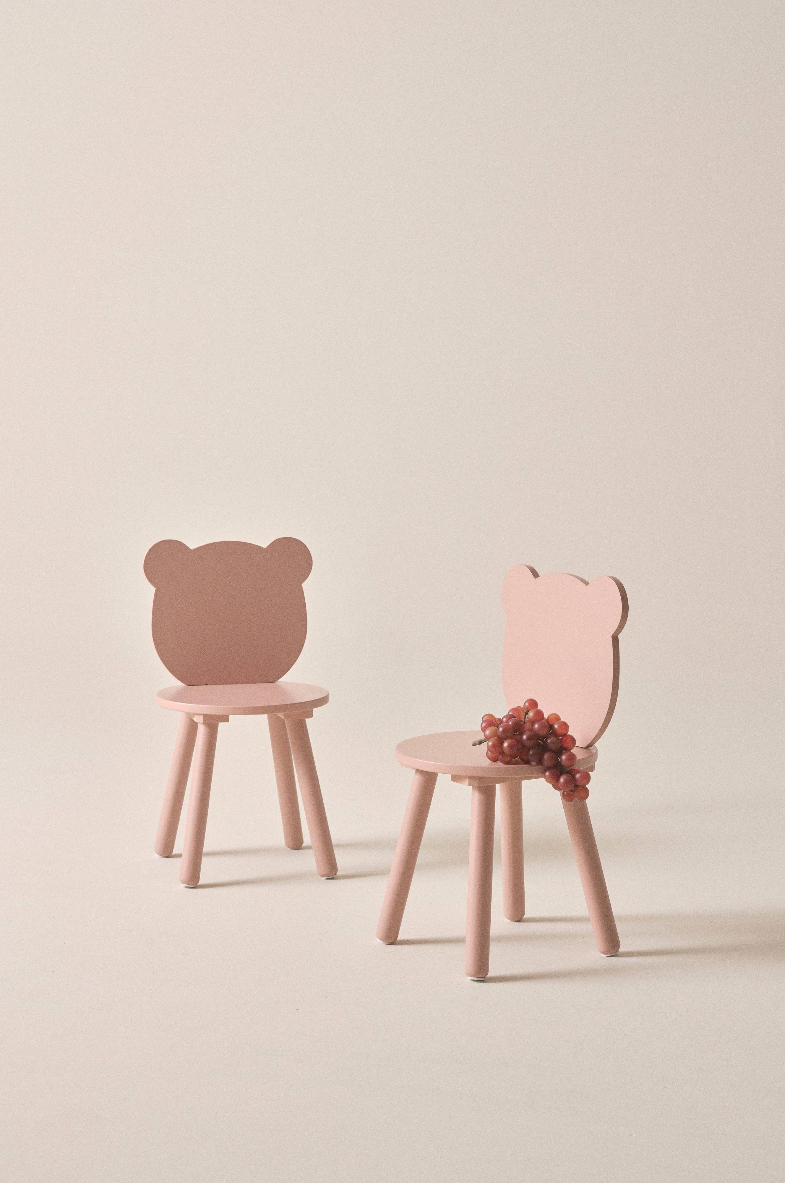 2-pak børnestole af massiv fyrretræ og MDF med malet overflade. Rundt sæde og ryglæn med silhuet som et bjørnehoved. De afrundede ben skråner udad hvilket gør stolen mere stabil, hvis nogen nu skulle klatre op på den. Nogen montering kræves. Samlevejledning medfølger.