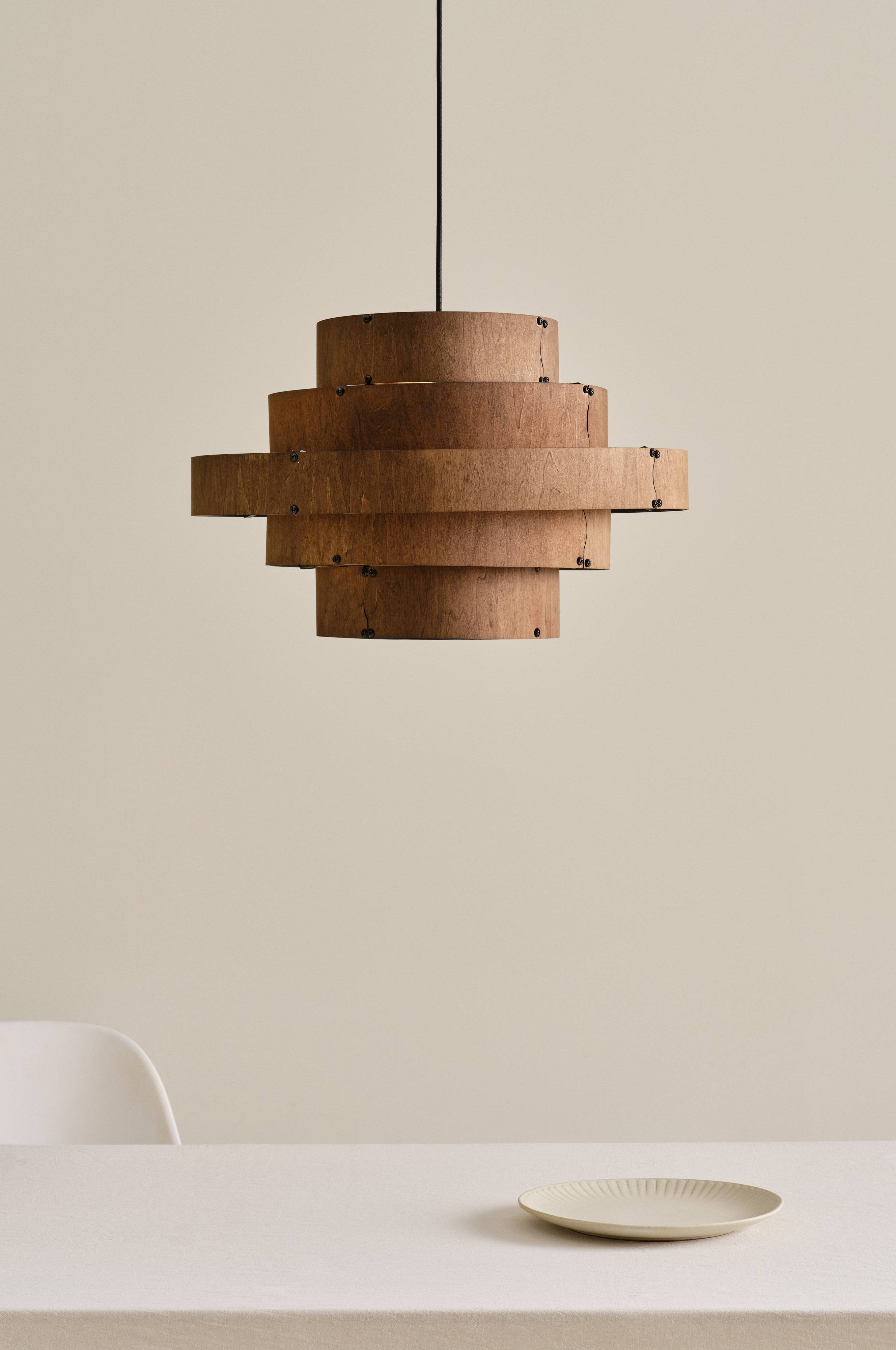 BECAH-loftslampen har et design med fem lag, der på mesterlig vis blander moderne æstetik med et strejf af vintagecharme. Lampeskærmen er lavet af træfinér og skaber en varm og indbydende atmosfære, perfekt til at hænge over et spisebord. Tekstilledningen forstærker den luksuriøse fornemmelse af denne smukt udformede lampe. BECAH er perfekt til dem, der sætter pris på unikke og elegante detaljer i hjemmet, og som problemfrit kombinerer klassiske og moderne designelementer.