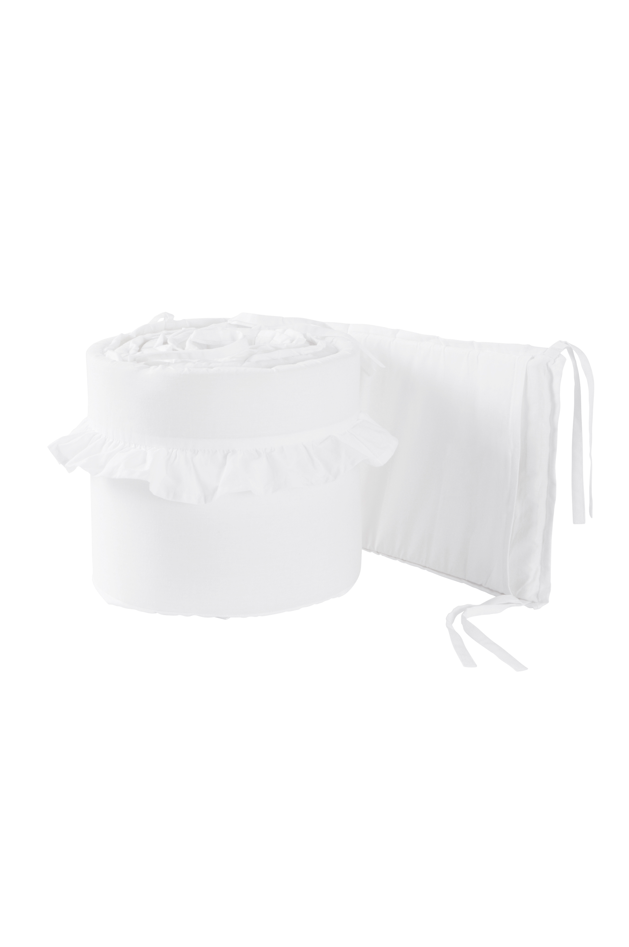 Sengerand med yderstof af økologisk bomuld med blød skumgummikerne og dekorative flæsedetaljer. Sengeranden gør tremmesengen mere hyggelig og forhindrer at barnet slår sig på tremmerne i søvne. Sengeranden bindes fast med bindebånd. Yderstoffet er aftageligt og vaskbart.