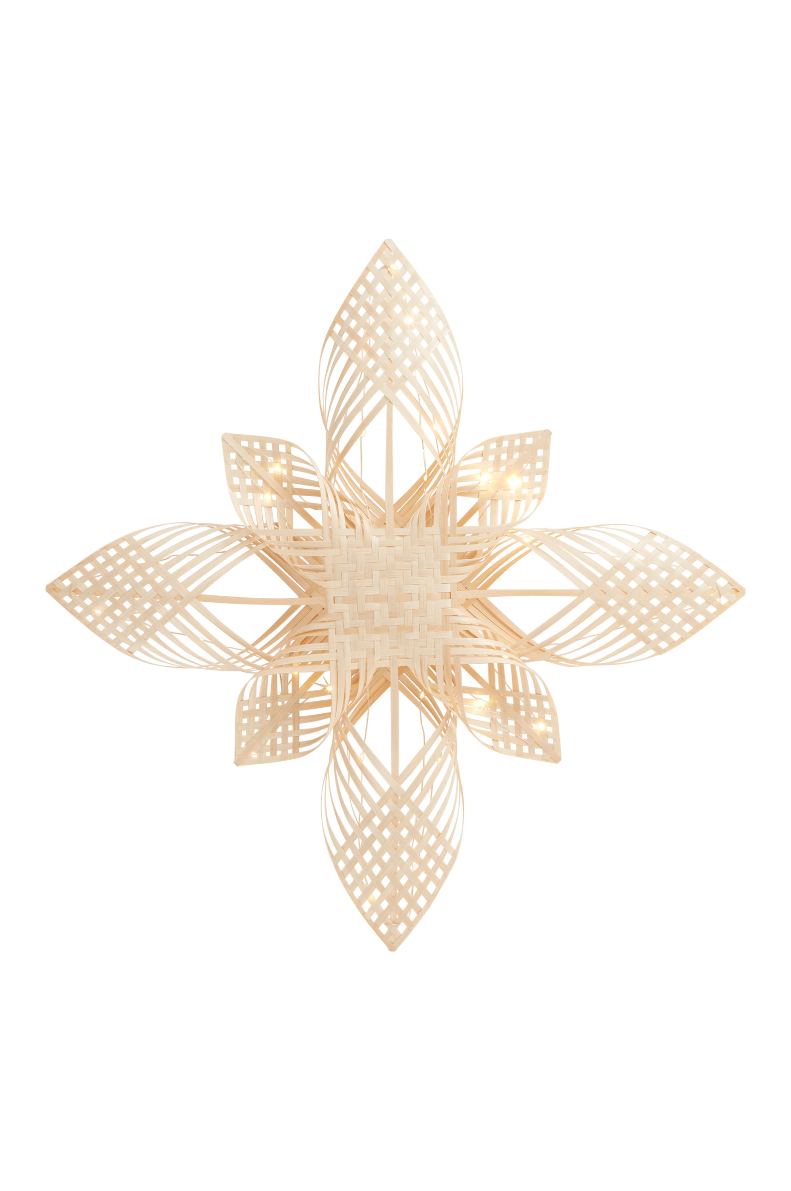 Håndlavet julestjerne af bambus med 25 små LED-pærer som lyser fint. Drives af 3 stk. AA-batteri. Batterier medfølger ikke.
