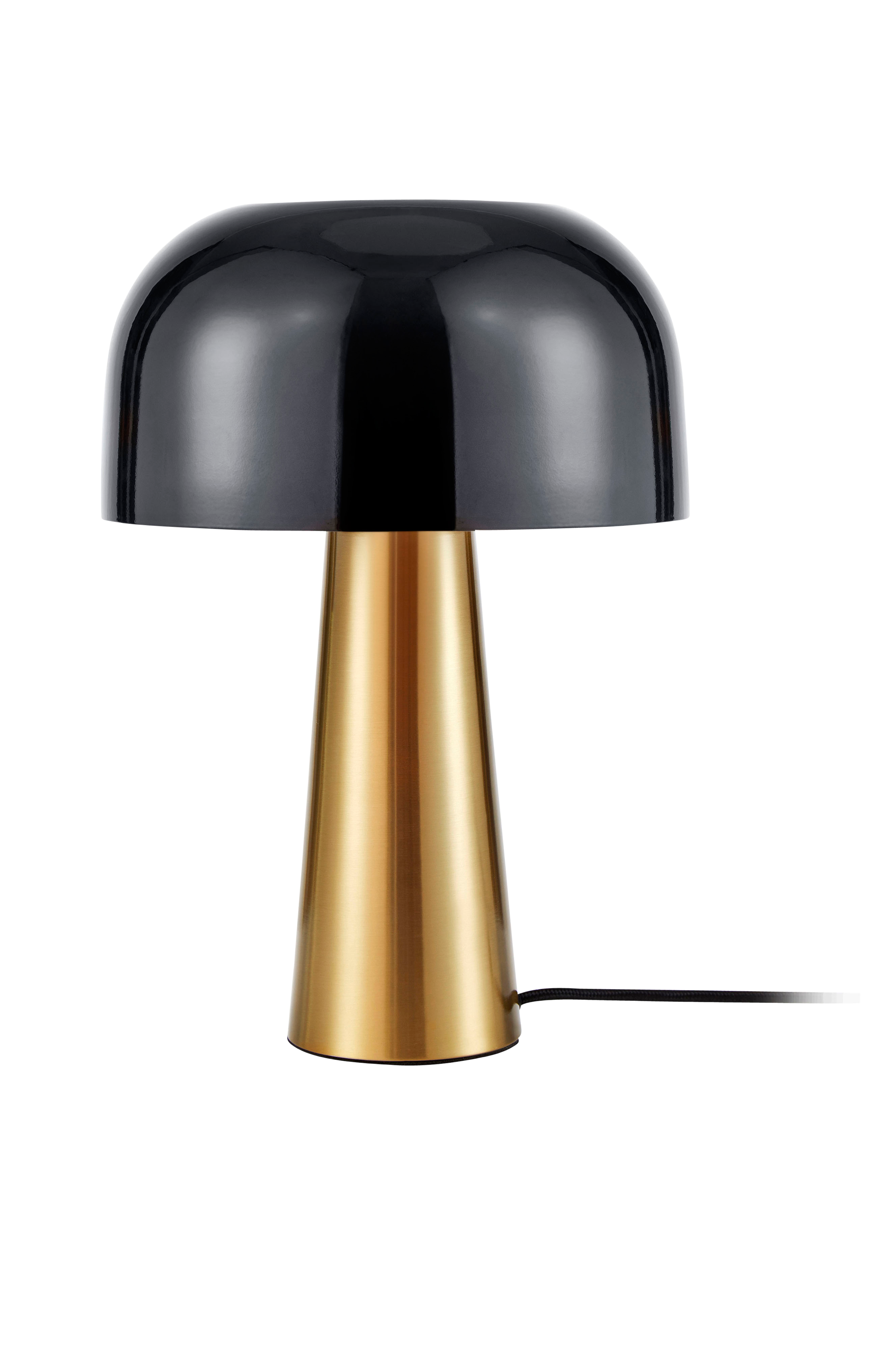 Smuk bordlampe i bronzepletteret metal med sort skærm. Med sine lige linjer og runde former bliver den en harmonisk men samtidigt fræk kreation. Sort stofledning, ledningslængde 2 meter.
