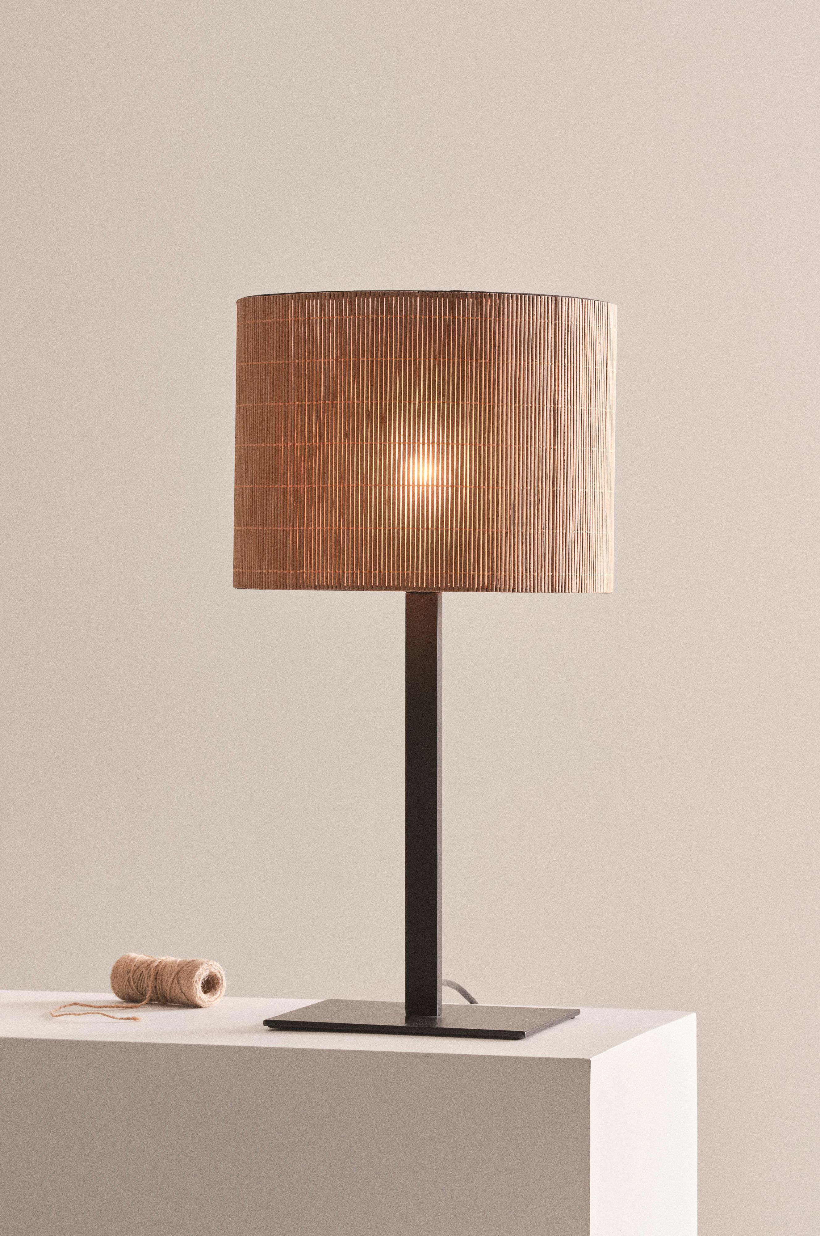 Bordlampe med skærm af naturlige bambusrør og fod af metal med mat overflade. Bambusrørene er foret med matteret laminat som giver et fint og hyggeligt skær, stellet i skærmen er af metal. Lampefoden har firkantet profil, også foden længst nede er firkantet. Det kantede giver fin kontrast til den naturlige og livagtige bambus. Sort plastledning med afbryder på ledningen.