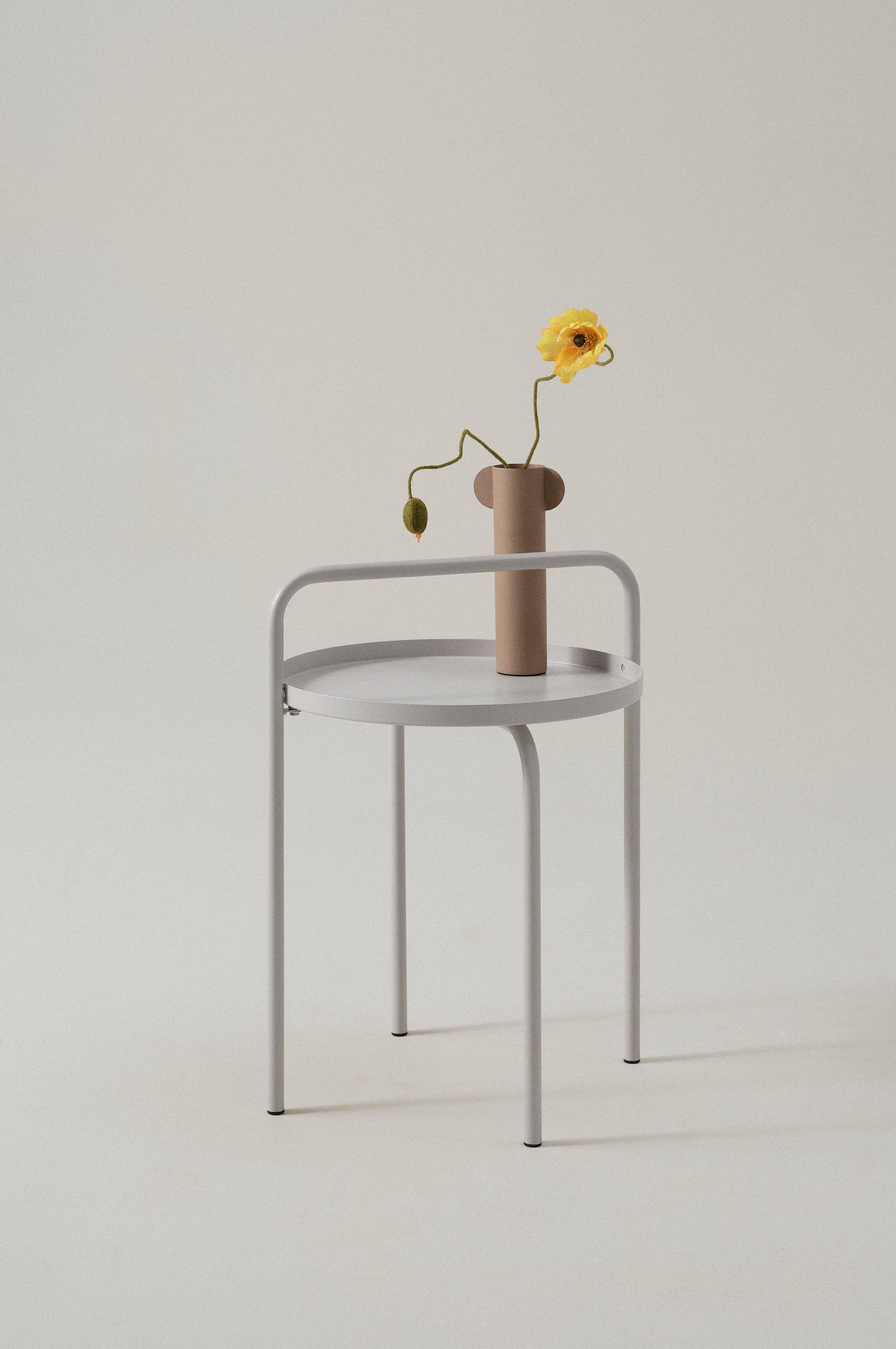 Beskrivelse: Rundt bord i pulverlakeret metal med håndtag.