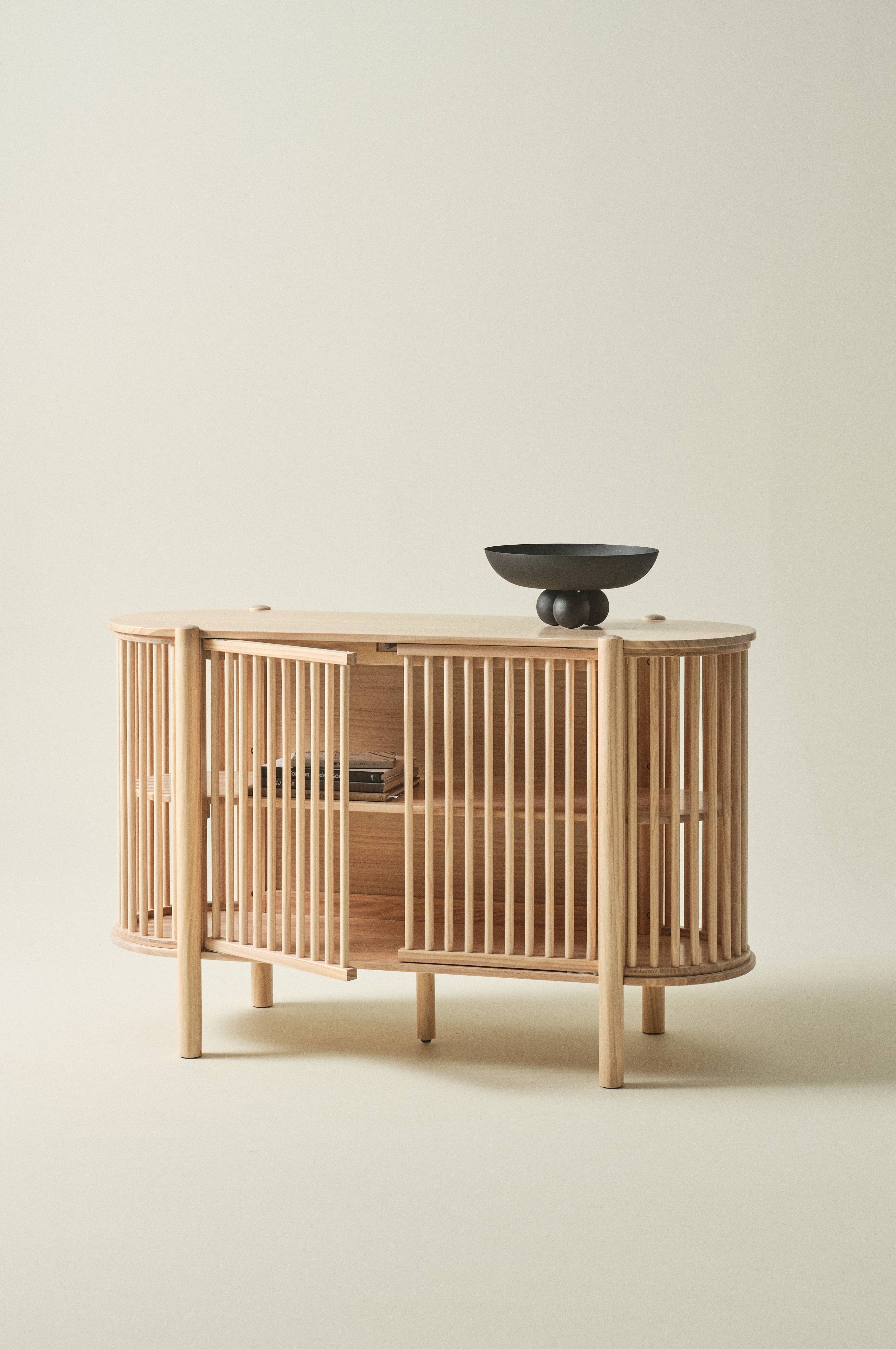Størrelse: Højde 90 cm, bredde 140 cm, dybde 50 cm. Frihøjde under møbel: 19 cm. Ribber diameter 9 cm.