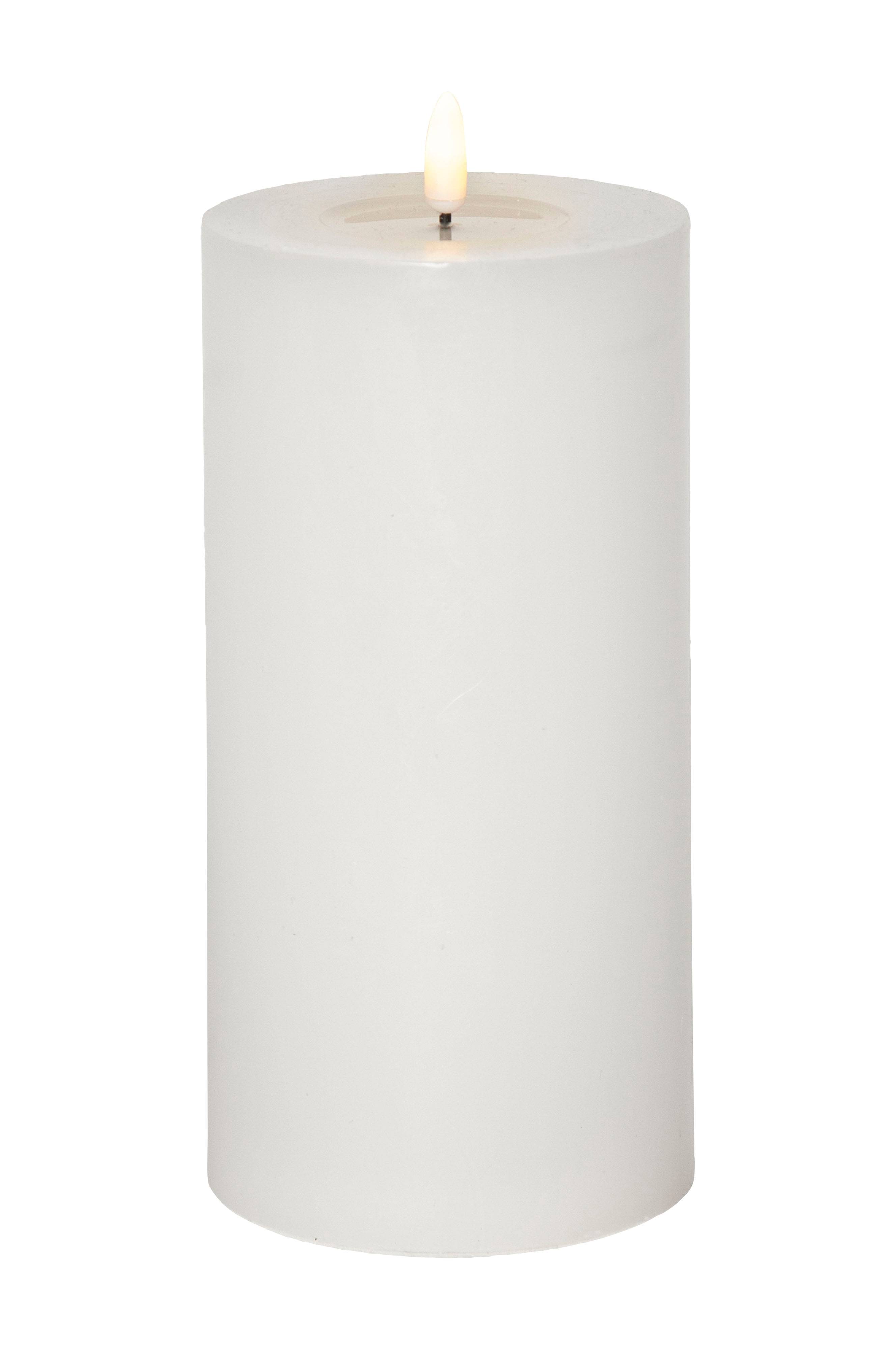 Flamme flow big er et elektrisk bloklys med vores naturtro flamme flamme og med en driftstid på 2500 timer. Dette lys har en skinnende fordybning under flammen, denne overflade ligner flydende voks, hvilket gør lyset endnu mere livagtigt. Lyset er 10 cm i diameter og højden 20 cm for voksdelen og ca. 22,5 cm totalhøjde med flammen. Dette led-lys vil være en smuk dekoration, både alene og i en gruppe sammen med andre lys fra vores flamme -serie. Det har en timerfunktion, og når kontakten er i timertilstand, skinner lyset i ca. 400 dage med en smuk realistisk flamme i varm hvid. Den drives af 2 c-batterier, som ikke medfølger.