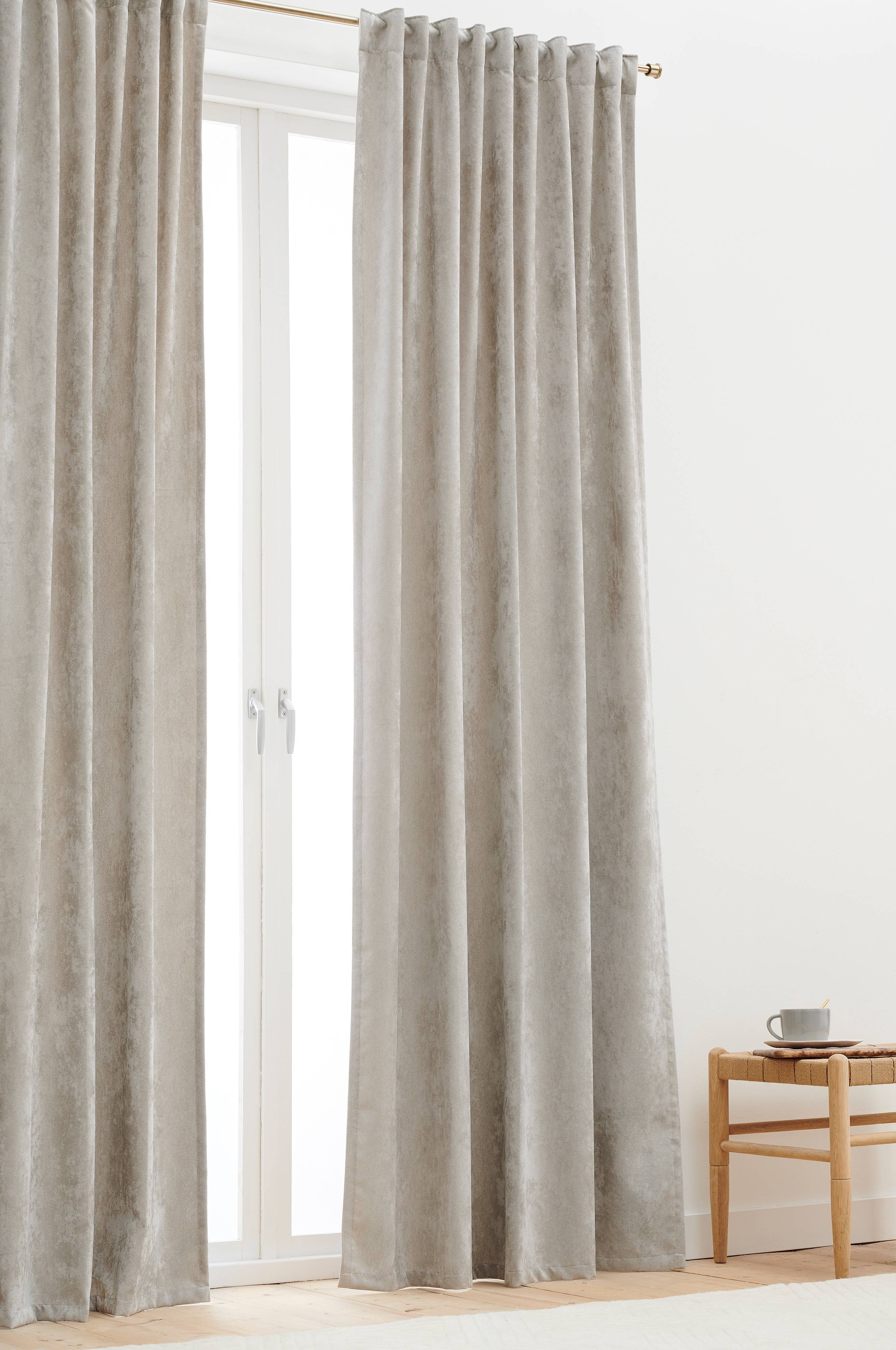 2-pak ensfarvede gardinlængder i polyesterblanding med påsyet multifunktionsbånd. Gardinet kan hænges op med fingerhægter, løbegang samt skjult strop.
