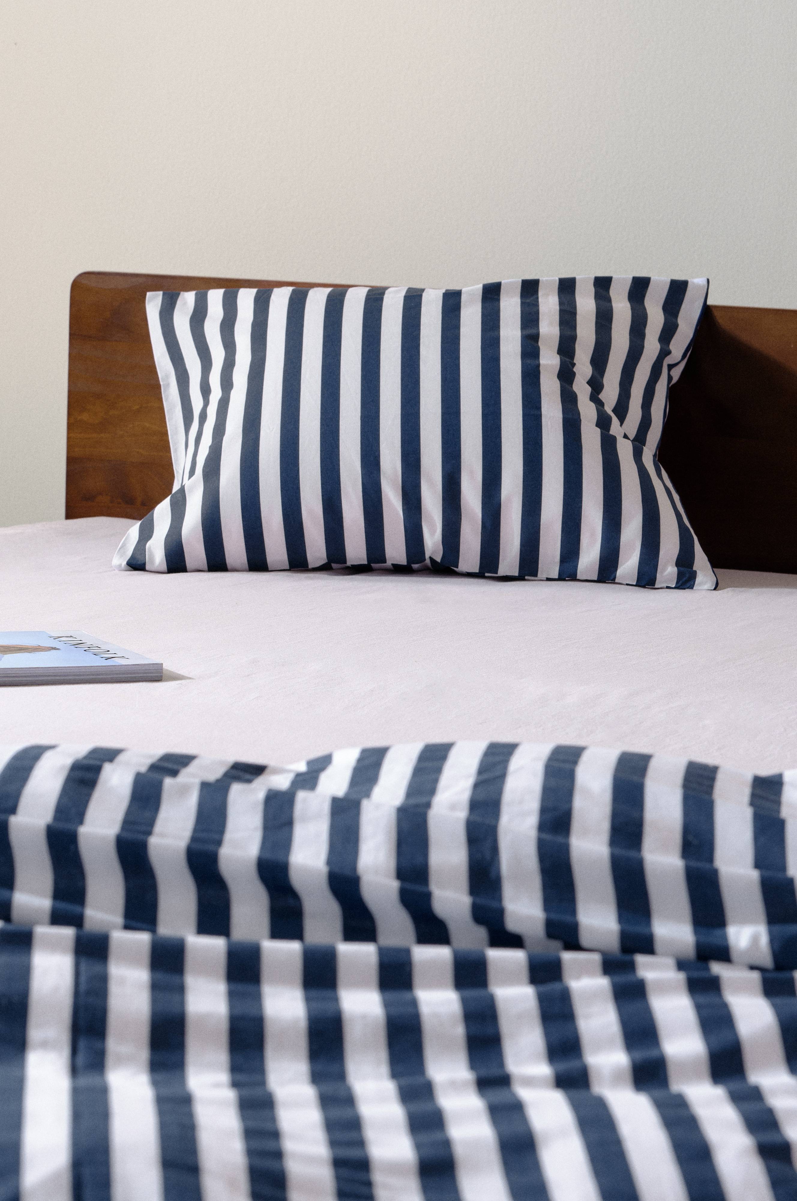 Smalt, stribet pudebetræk i økologisk bomuld. De klassiske striber fungerer lige godt til små og store. Stoffet har et behageligt print, bomuld er køligt og behageligt mod huden, og følelsen af at krybe ned i en nyredt seng er svær at slå. Stribemønsteret er trykt i lyse, muntre farver, hvor hver anden stribe er hvid.