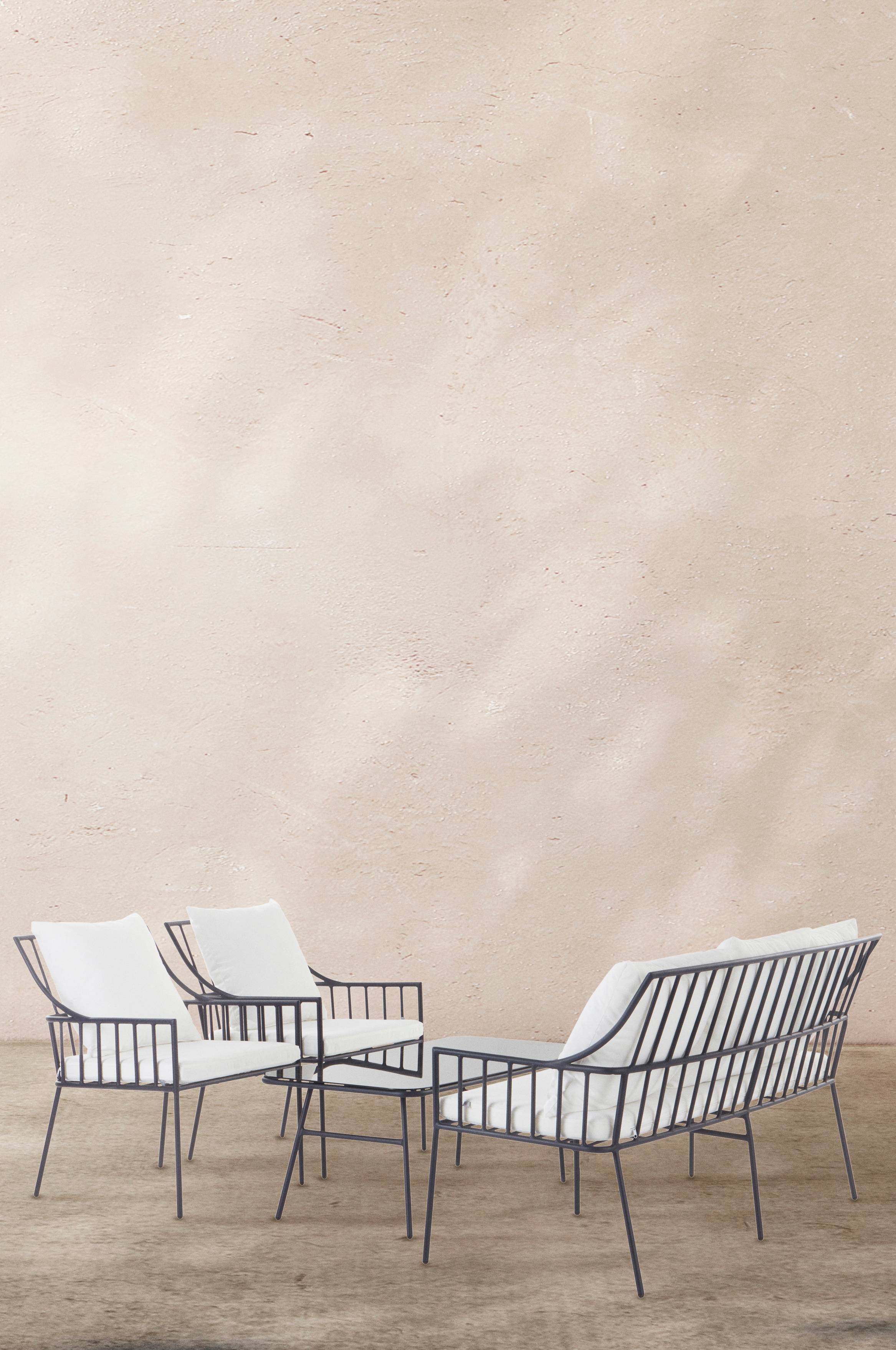 Loungemøbler i fire dele af pulverlakeret aluminium med mat overflade, som ikke blænder i solskin. Loungegruppen indeholder et sofabord, to lænestole, en sofa samt puder og siddehynder. Lænestolene og sofaen har siddehynder og puder med betræk af polyester og foam af skumplastgummi. Bordet har bordplade af sort glas.