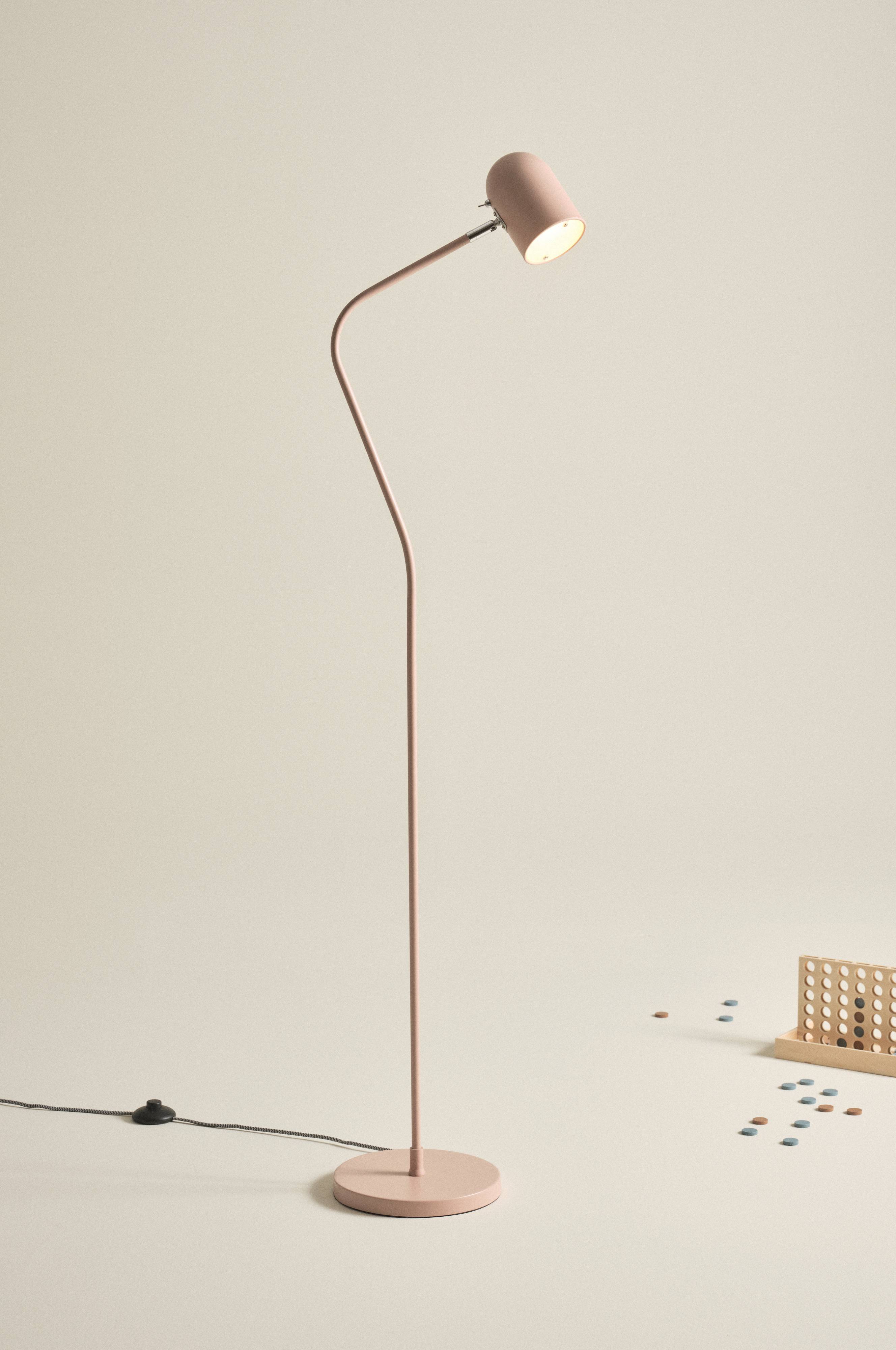 BOOMI er en malet gulvlampe af metal med detaljer i krom. Skærmen har lys inderside som reflekterer lyset fint. Sort/hvid stofledning med strømafbryder på ledningen. Lampen er ujordet, klasse 2. Stikket er Europa-model, det vil sige fladt med tyndere stikben (4 mm).