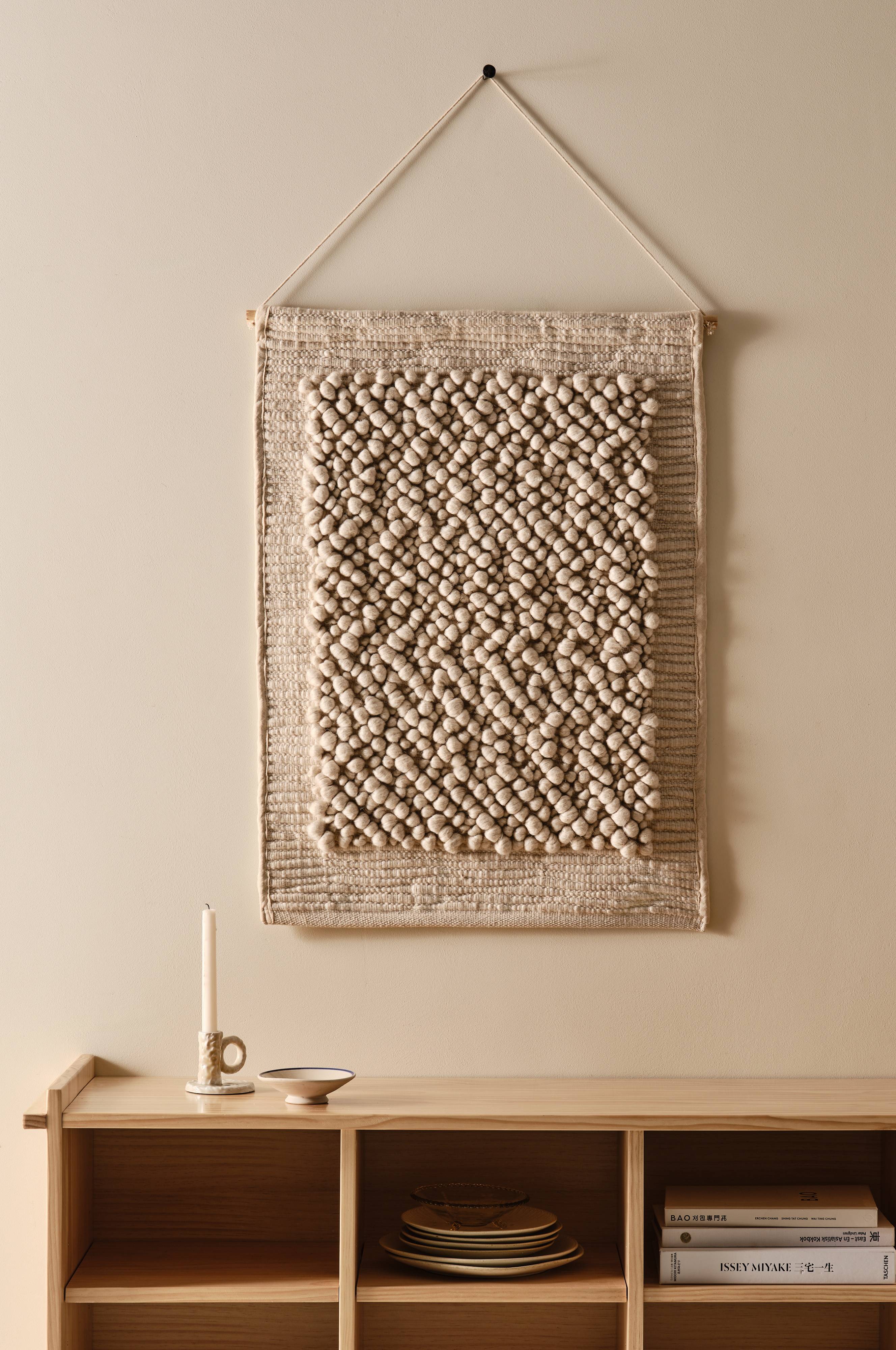 Vægophænget BORDEAUX har et fantastisk design af uldmixgarn. Det har en vævet base med et tuftet mønster og suppleres af en praktisk træstang. Dette dekorative stykke tilføjer tekstur og varme og forbedrer ethvert rum med sin indbydende charme.