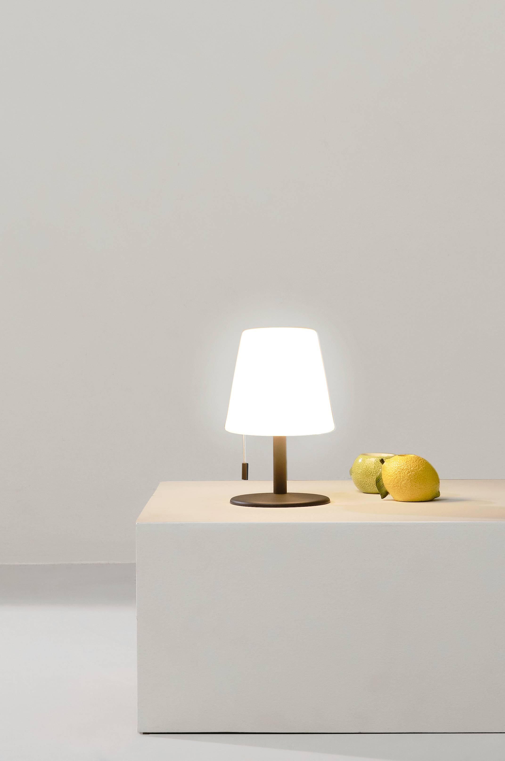 Stilren bærbar bordlampe med USB til udendørs brug. Lampen spreder et hyggeligt varmt hvidt lys, som du kan justere til svagt eller skarpt lys ved at trække i den hængende snor. En dejlig lampe, der giver et behageligt ekstra lys i varme sommeraftener i haven eller på altanen. Hvidt LED-kabel til opladning, ledningslængde 1 meter. Drives med 1 genopladeligt Li-Ion-batteri. Batterier medfølger.