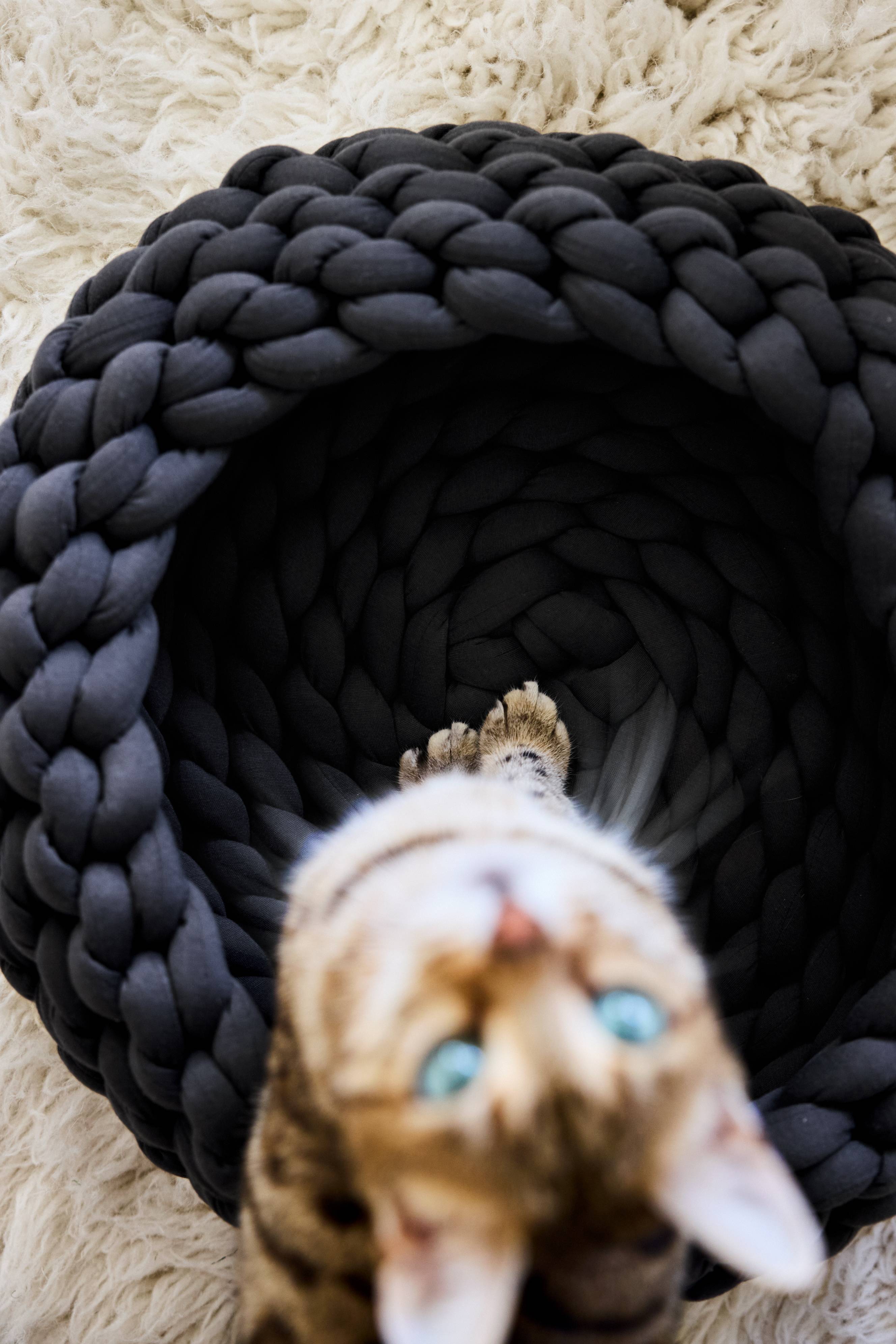 Kurvformet kæledyrsseng lavet af flettet polyesterstof. Perfekt til at give din kat et behageligt og hyggeligt sted at krybe sammen. BOWIE-sengen til kæledyr vil tilføre varme og charme til dit hjems interiør, samtidig med at din pelsede ven føler sig tryg og afslappet.