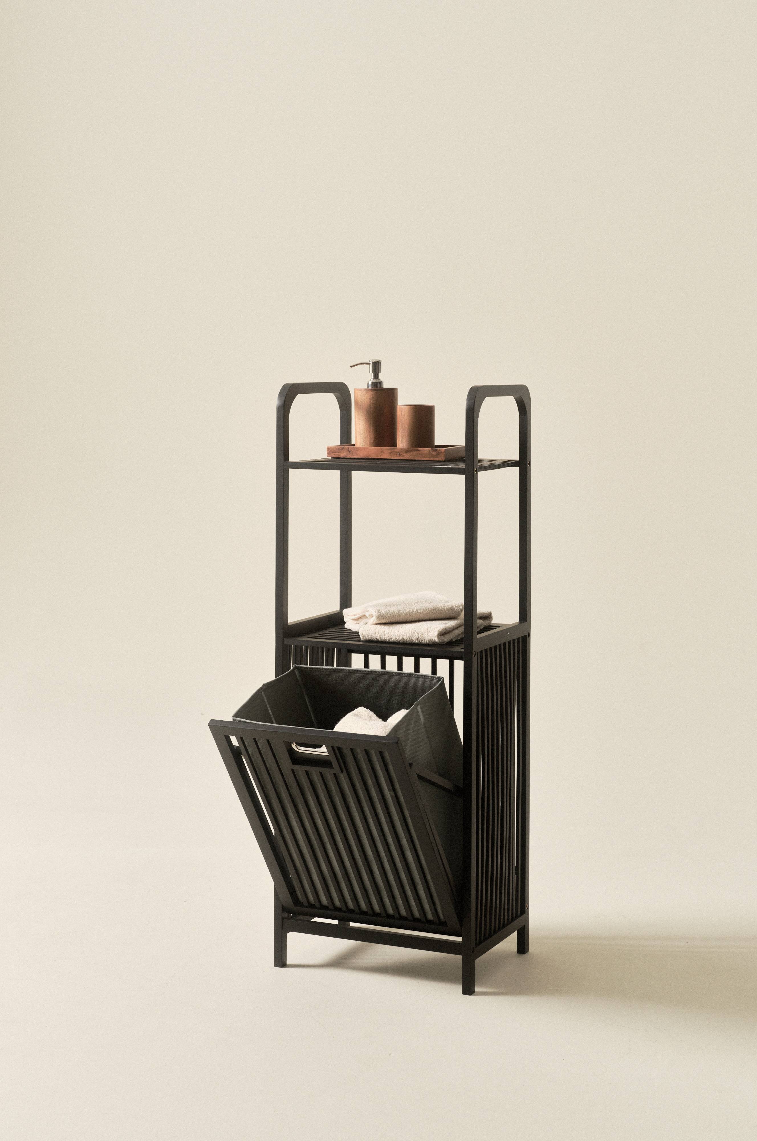 Praktisk og stilren vasketøjskurv i bambus. En smart og flot løsning til at skjule snavsetøjet samtidigt med at du får ekstra plads til opbevaring. Selve vasketøjskurven kan løftes ud af reolen og nemt tømmes ved vaskemaskinen. Vasketøjskurven har håndtag af rustfrit stål. Skal færdigsamles. Samlevejledning medfølger.