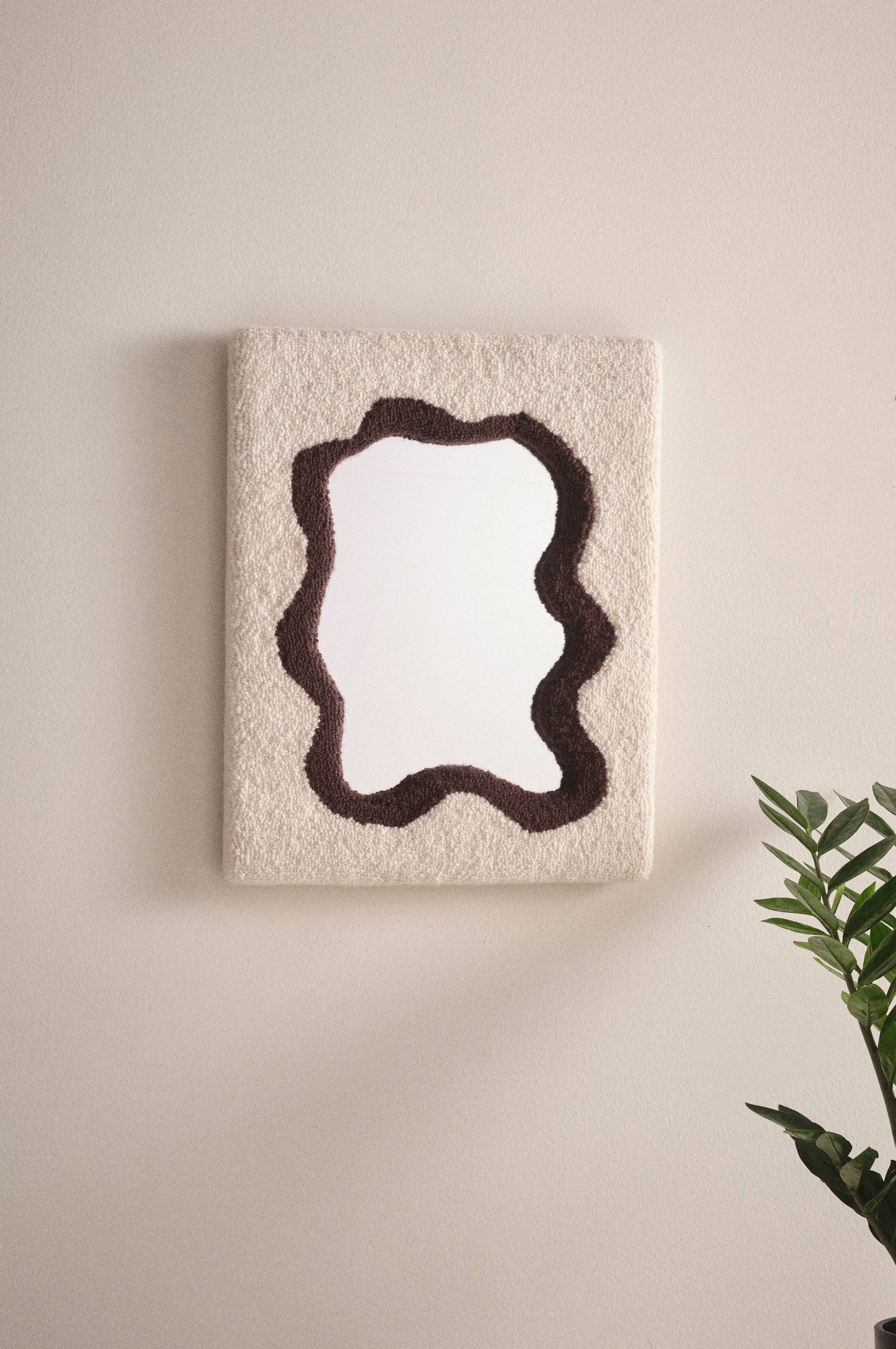 Spejl med fed ramme af MDF, der er beklædt med et luvtæppe i uld. Rammens inderste kant har organisk, blød form og luvtæppet som rammen er betrukket med er tofarvet. Spejlet kan hænges både stående og liggende, alt efter hvad du foretrækker. Bagsiden er af MDF.
