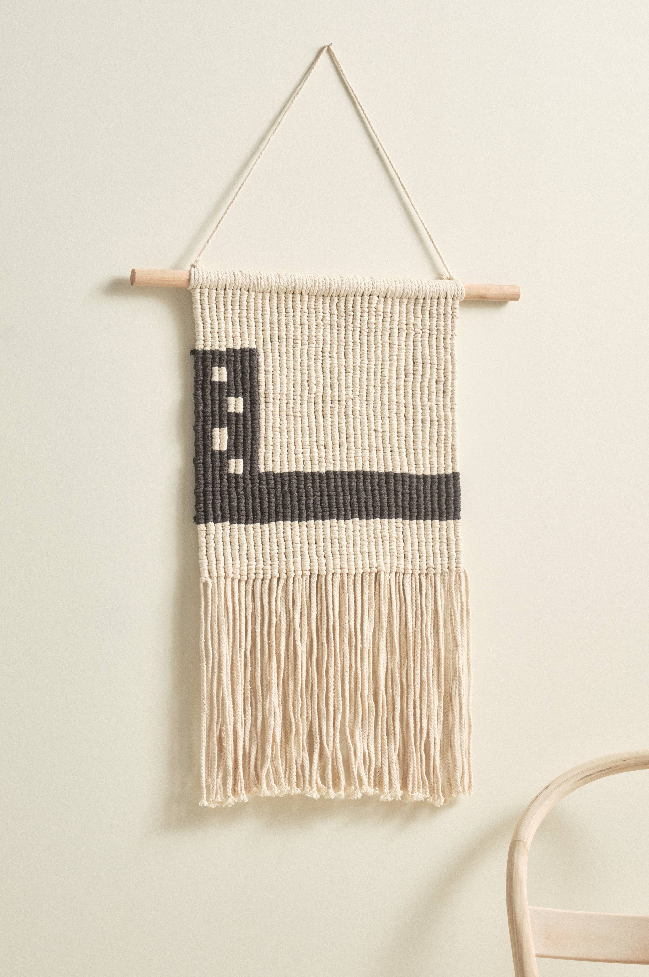 Vævet vægdekoration af bomuld og med træstav foroven. Vægtæppet er vævet i groft garn og har lange frynser forneden. Ophængningen består af en træstav med snore i yderkanterne.