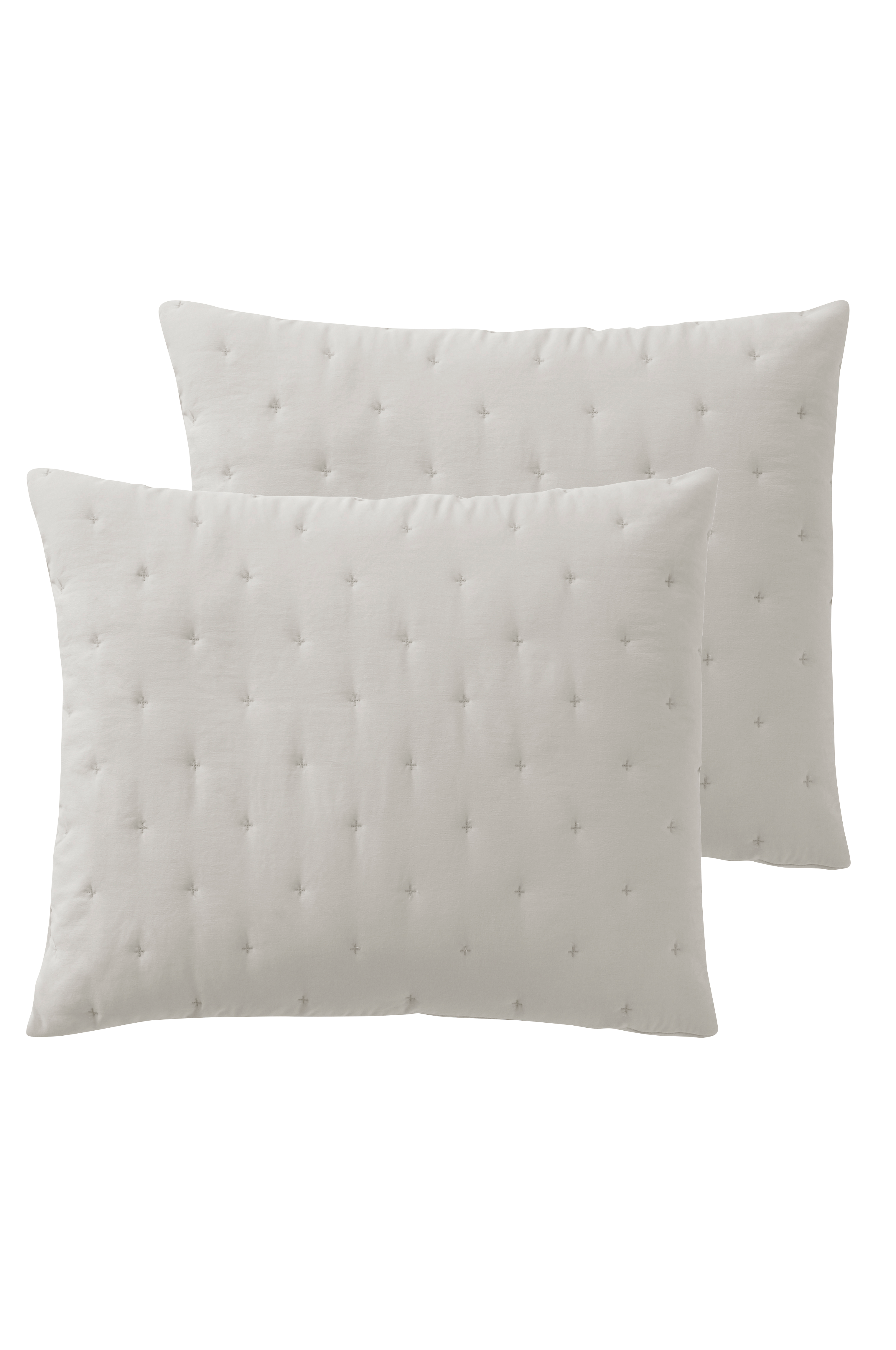 2-pak pudebetræk syet i blød polyester som er vasket for at få et skønt udtryk. Pudebetrækket har enkel quiltning af broderede små kryds som danner et diskret mønster på forsiden. Stoffet har en let vattering som holdes på plads af quiltningen. Bagsiden er glat. Skjult lynlås på bagsiden.