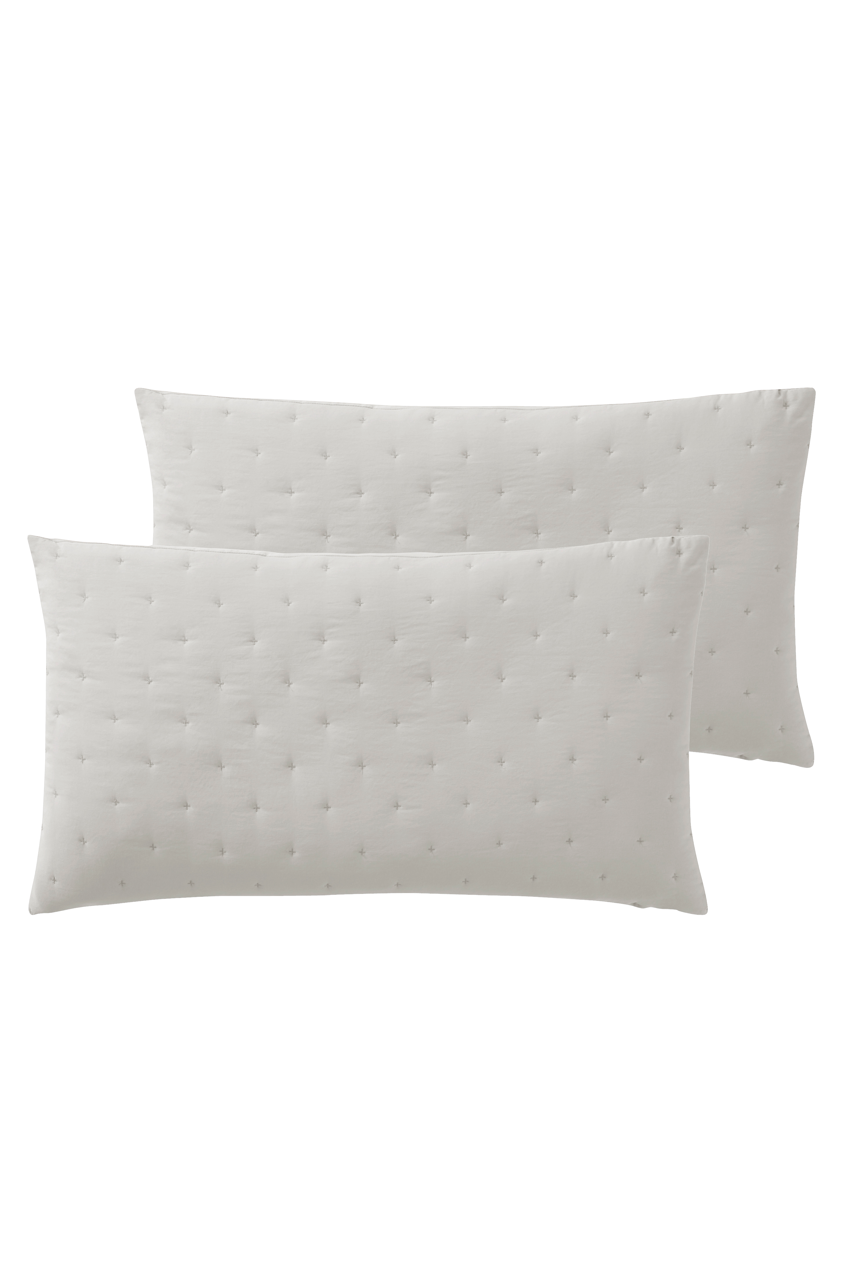 2-pak pudebetræk syet i blød polyester som er vasket for at få et skønt udtryk. Pudebetrækket har enkel quiltning af broderede små kryds som danner et diskret mønster på forsiden. Stoffet har en let vattering som holdes på plads af quiltningen. Bagsiden er glat. Skjult lynlås på bagsiden.