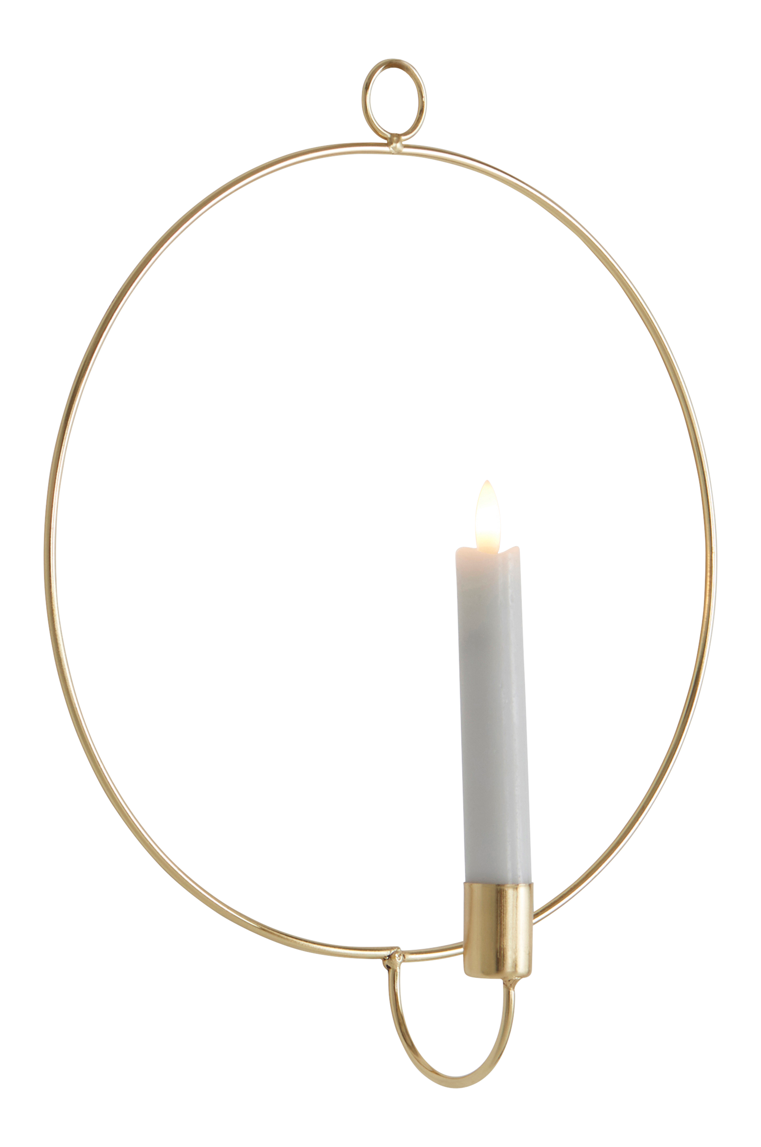 Vægdekoration i metal med messingfinish, formet som en ring med dekorativt LED-antiklys. CANDLE RING har en indbygget repeterende timer som er tændt i 6 timer og slukket i 18. Drives af 1 stk. AA-batteri. Batterier medfølger ikke.