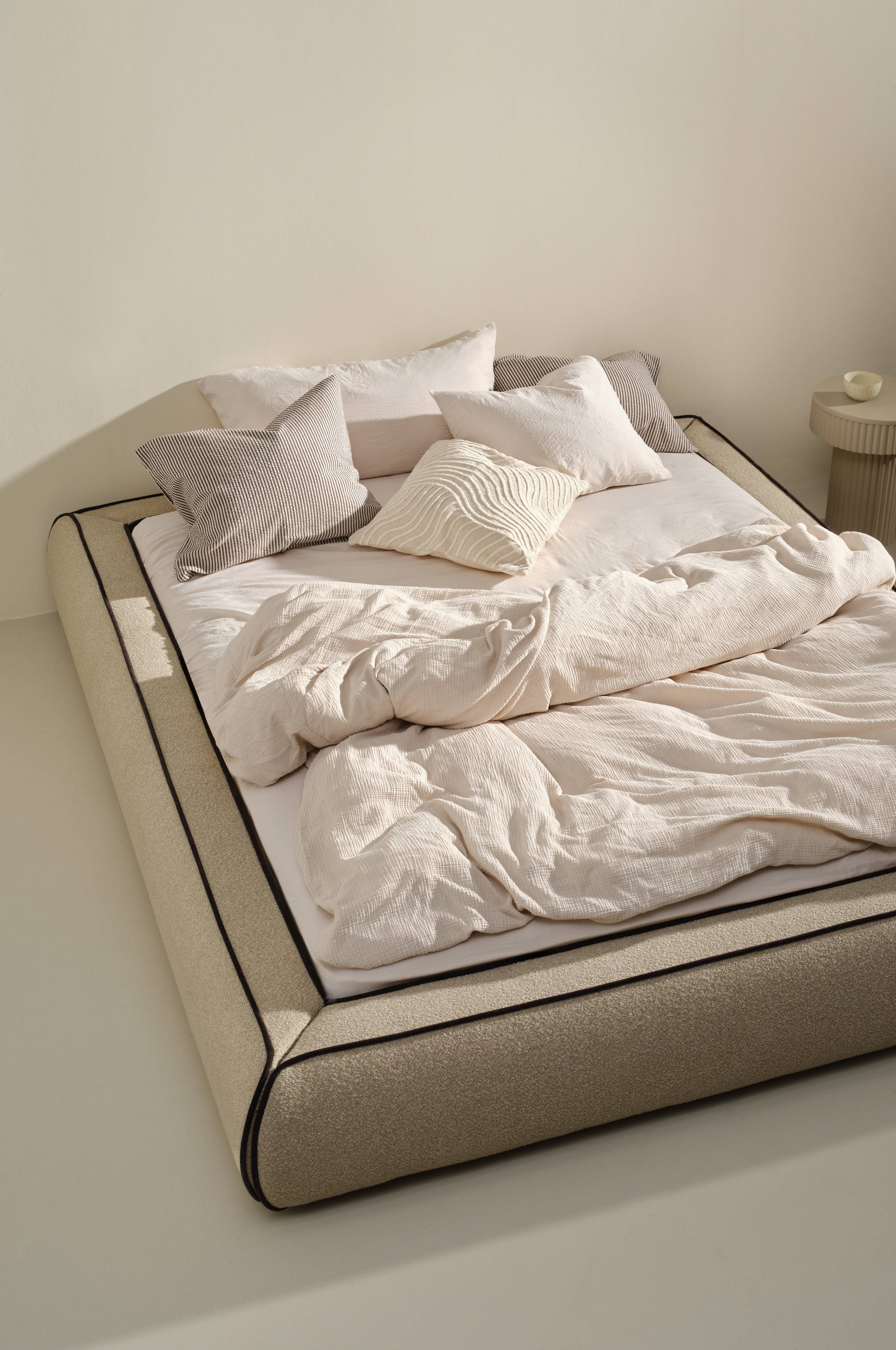 CANNA-sengerammen har en polstret ramme indhyllet i bouclestof, der er fremhævet med kontrastfarvede rør for ekstra stil. Det moderne design giver et elegant touch til enhver soveværelsesindretning og kombinerer ubesværet komfort med moderne æstetik. Denne sengeramme er perfekt til dem, der søger et unikt midtpunkt, og den giver en luksuriøs stemning til dit soveområde.