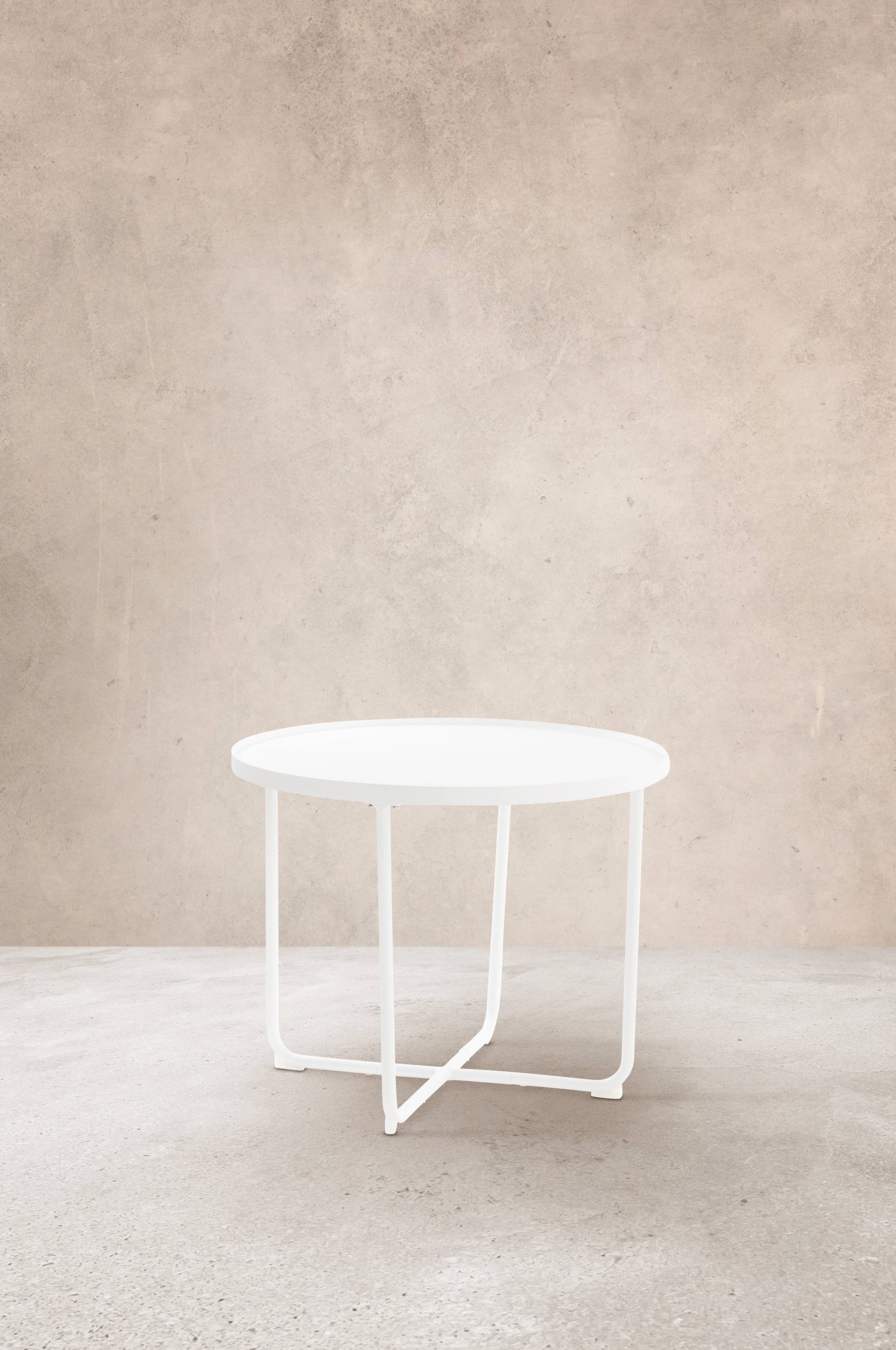 Sidebord af pulverlakeret aluminium. Bordet har en lille kant rundt om bordpladen. Tåler at stå udendørs, aluminium ruster ikke. Lav vægt.
