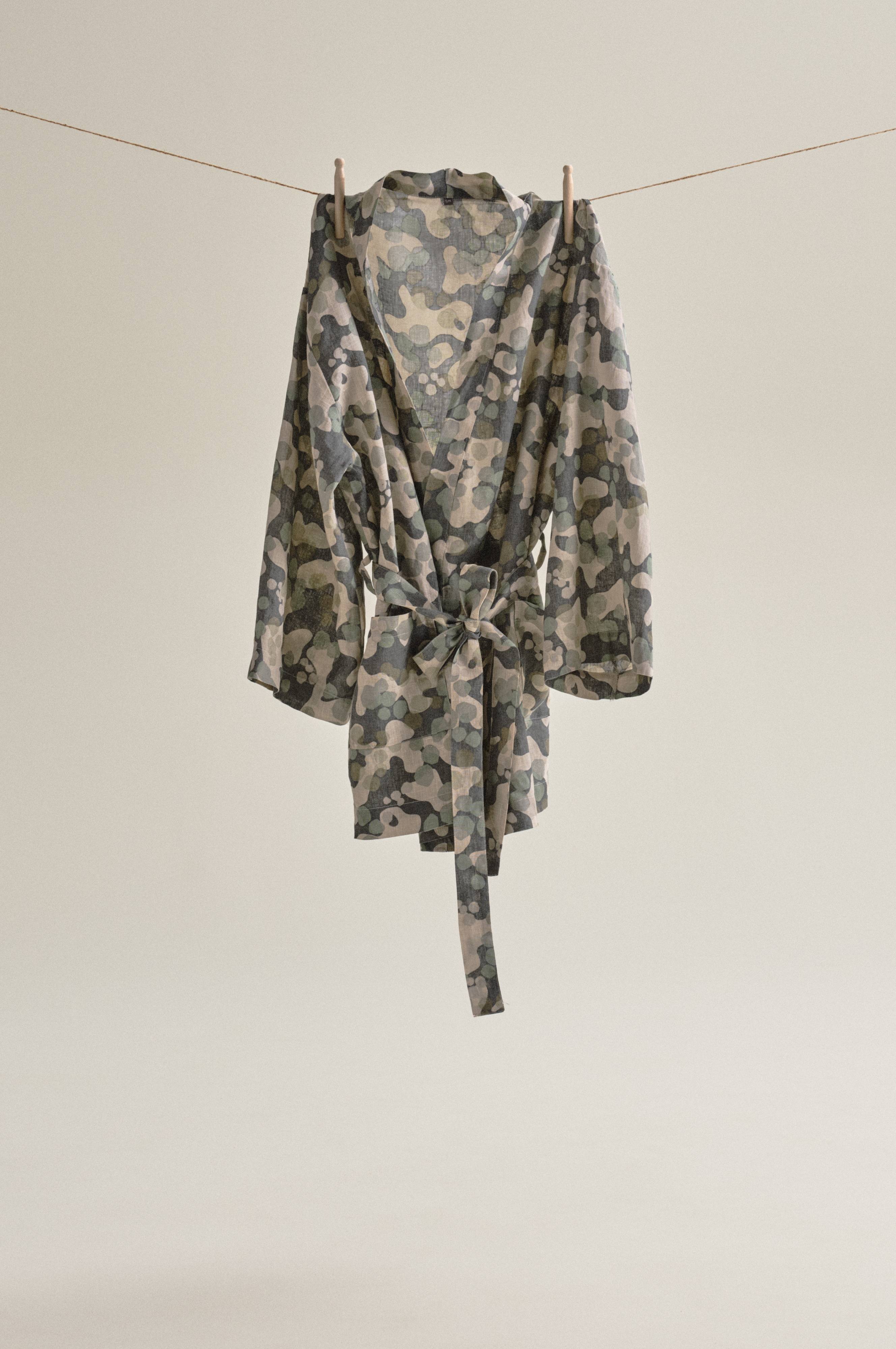 Kimono i kort model af naturligt og behageligt hør med trykt mønster designet af Maria Carlberg. Den behagelige hørkvalitet er blevet vasket for at blive vidunderligt blød og behagelig. Hyggelig model med bindebånd i taljen og to lommer foran.
