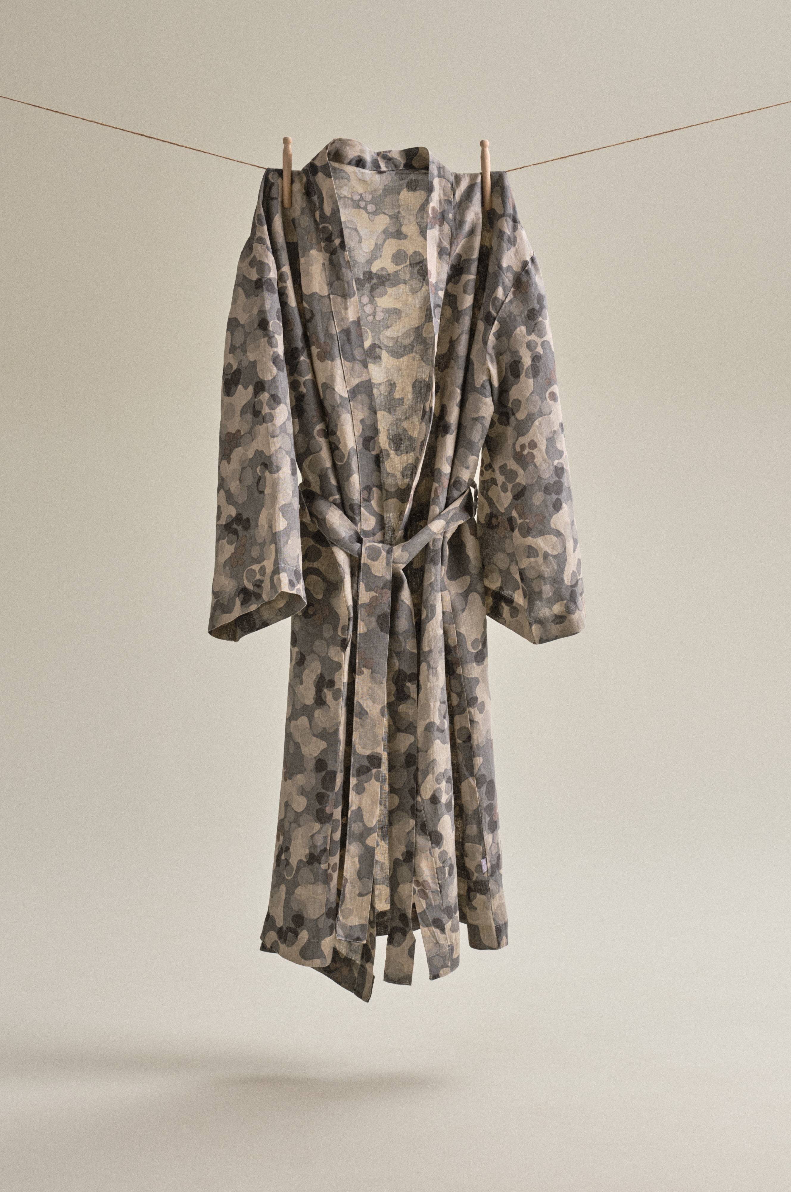 Kimono i lang model af naturligt og behageligt hør med trykt mønster designet af Maria Carlberg. Den behagelige hørkvalitet er blevet vasket for at blive vidunderligt blød og behagelig. Hyggelig model med bindebånd i taljen og to lommer foran.