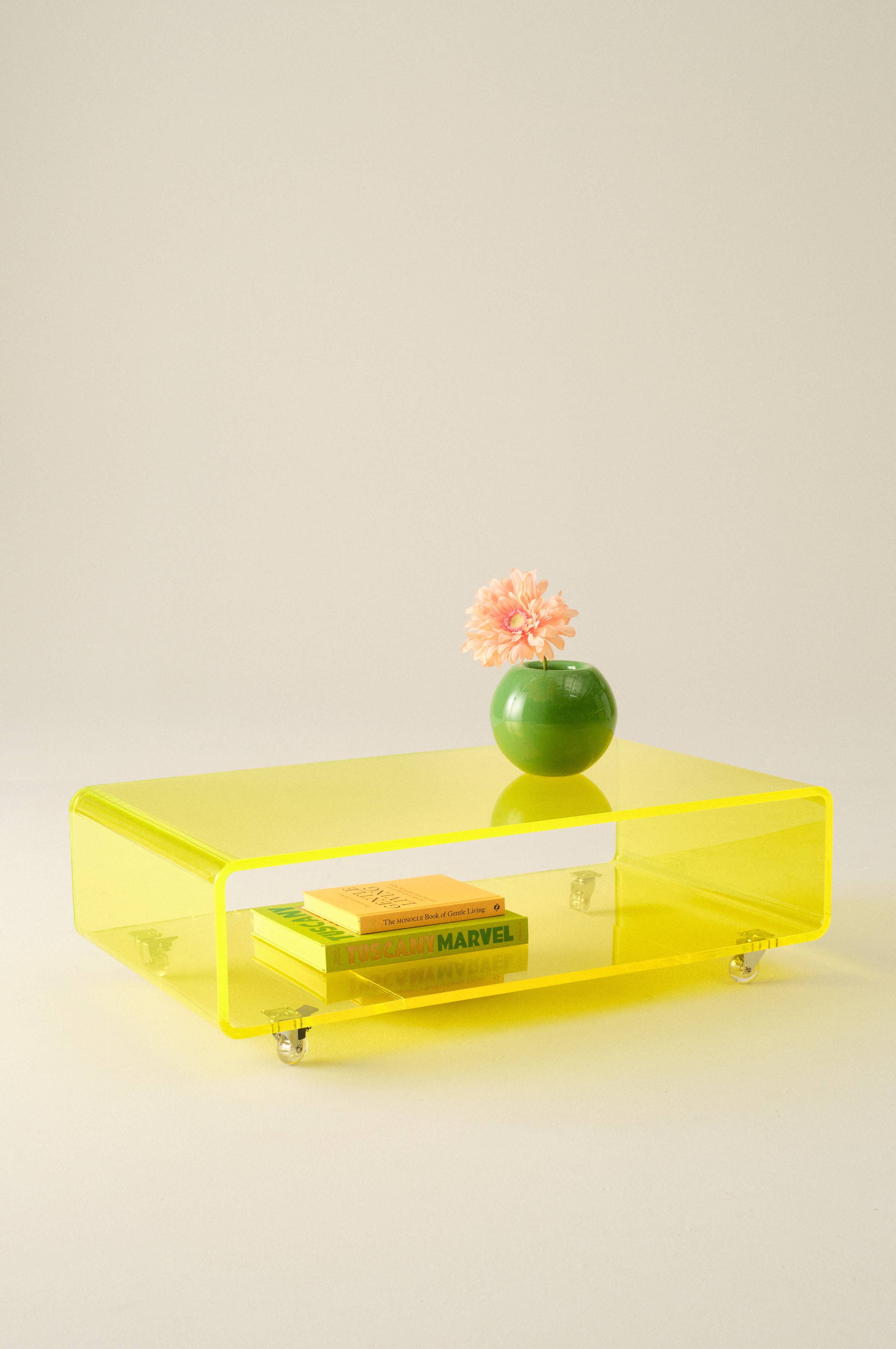 Sofabord af akrylglas. Sofabordet er lidt cocky i sin enkelthed, med et futuristisk udtryk og rene linjer. Hylden nedenunder er åben fra to sider, hvilket giver opbevaring. Her kan du sætte både Yatzy-terninger og fjernbetjening, alt bekvemt tæt på. De små transparente hjul nedenunder gør bordet nemt at flytte. CARLTON giver rummet luftighed og et frisk udtryk.