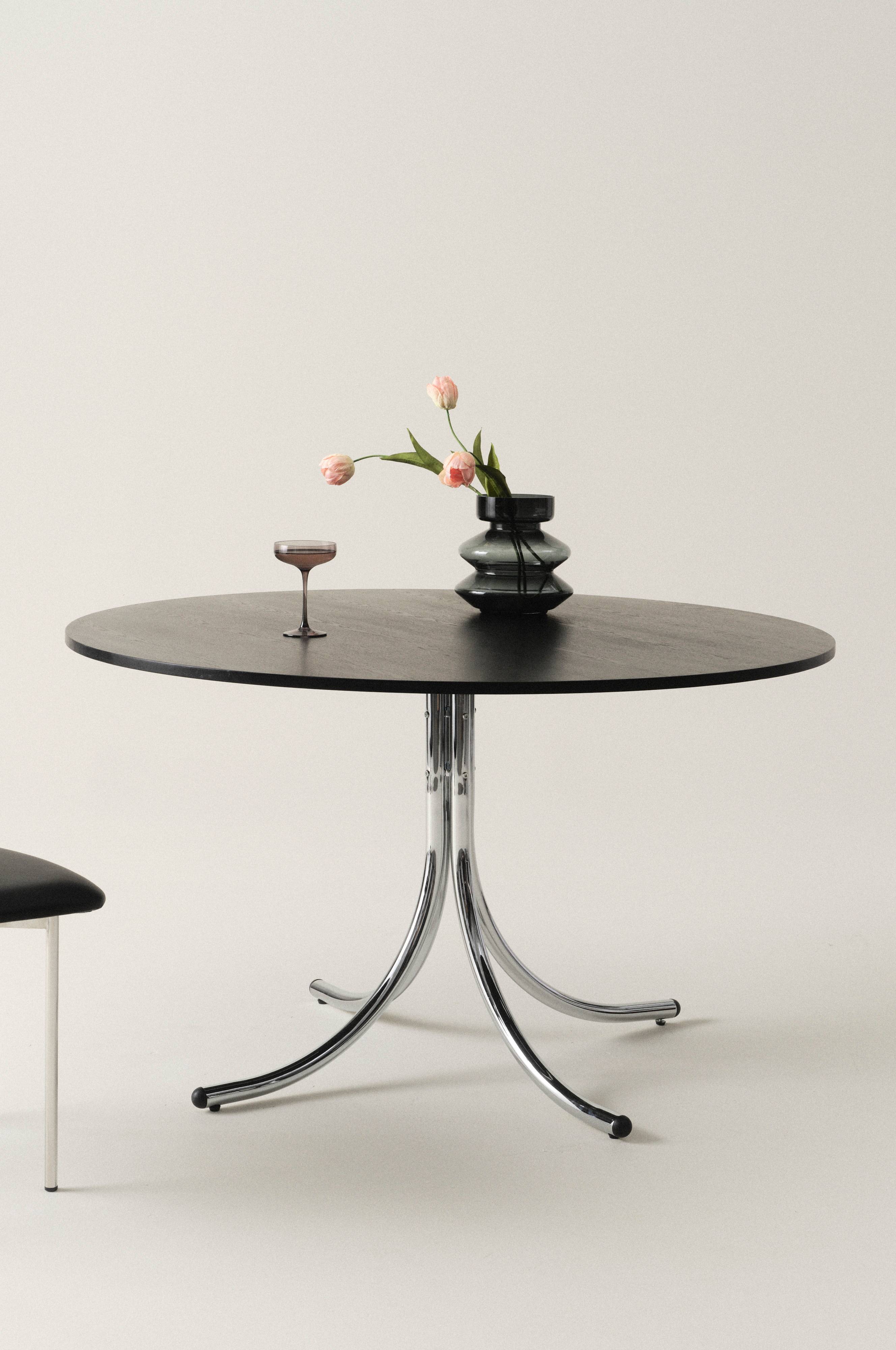 Rundt spisebord med blankt, forkromet understel af jernrør og bordplade af FSC-certificeret MDF med forskellige overfladebehandlinger; valnøddefiner, hvidlakeret og ask finer med sort, vandbaseret finish. Det stilrene spisebord har en flot retrostil og tankerne går tilbage til de herlige 70'ere. At samles om et rundt spisebord giver fællesskab med alle ved måltidet. Skal færdigsamles. Samlevejledning medfølger.