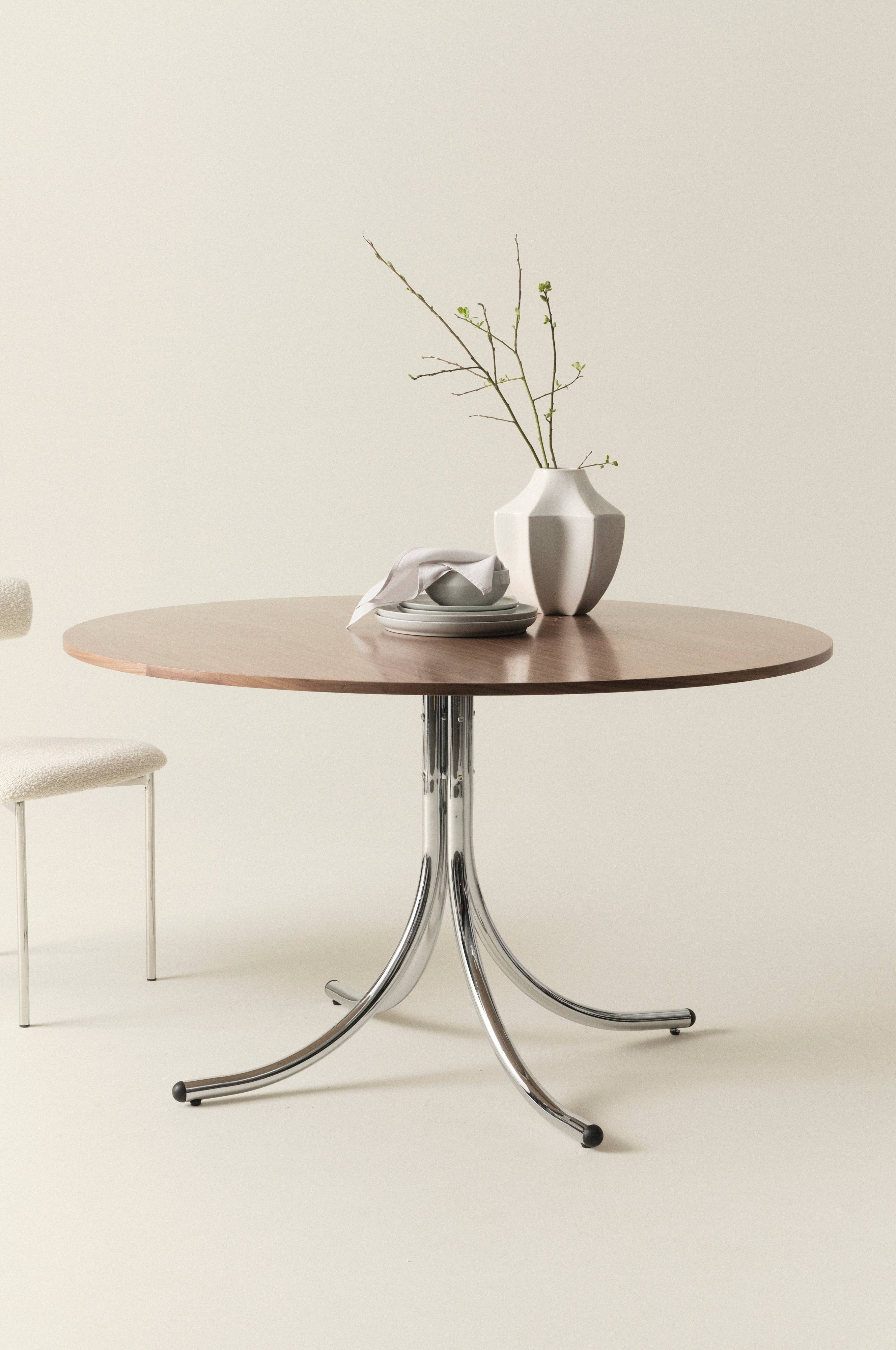 Rundt spisebord med blankt, forkromet understel af jernrør og bordplade af FSC-certificeret MDF med forskellige overfladebehandlinger; valnøddefiner, hvidlakeret og ask finer med sort, vandbaseret finish. Det stilrene spisebord har en flot retrostil og tankerne går tilbage til de herlige 70'ere. At samles om et rundt spisebord giver fællesskab med alle ved måltidet. Skal færdigsamles. Samlevejledning medfølger.