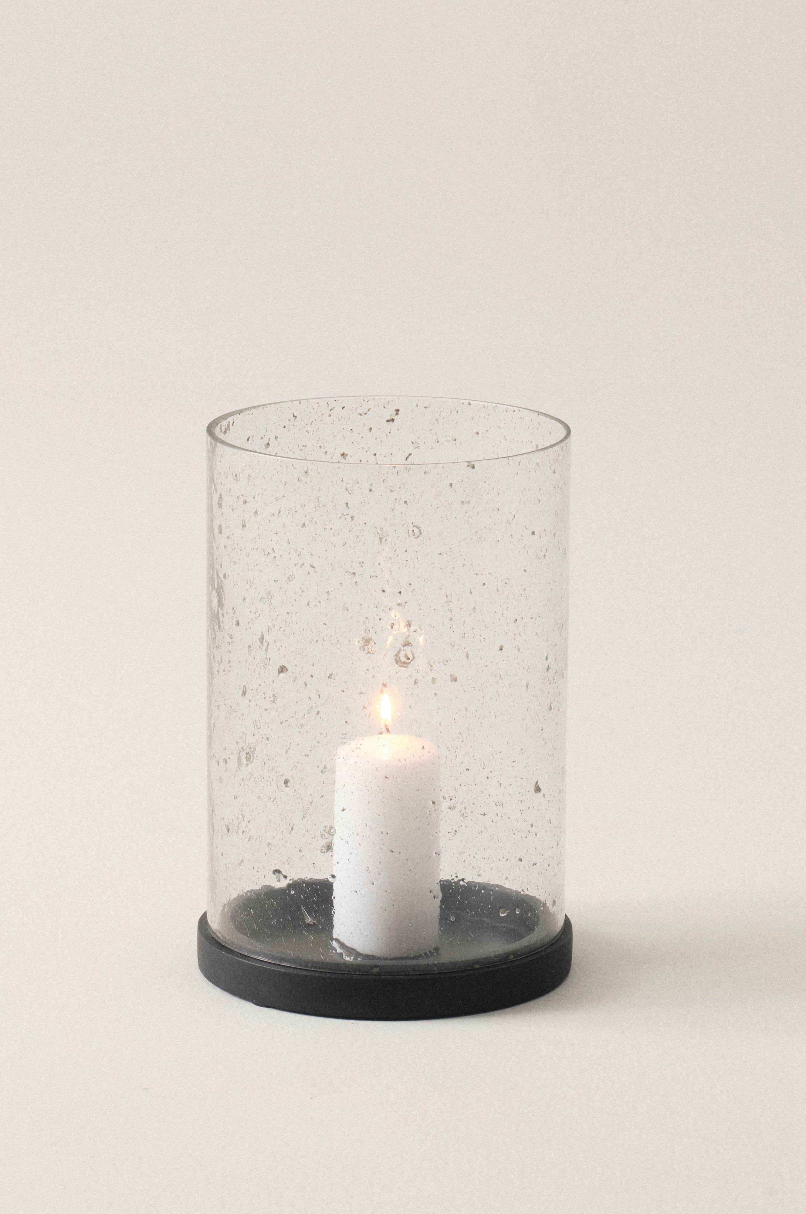 CHRIS er en smuk lanterne med en glaskuppel med bobler, der er åben foroven. Glasset står på et fad i mangotræ der har en beskyttende metalplade under. Det boblende glas giver et håndblæst look og spreder et hyggeligt skær fra lyset. CHRIS passer til både fyrfadslys og bloklys.