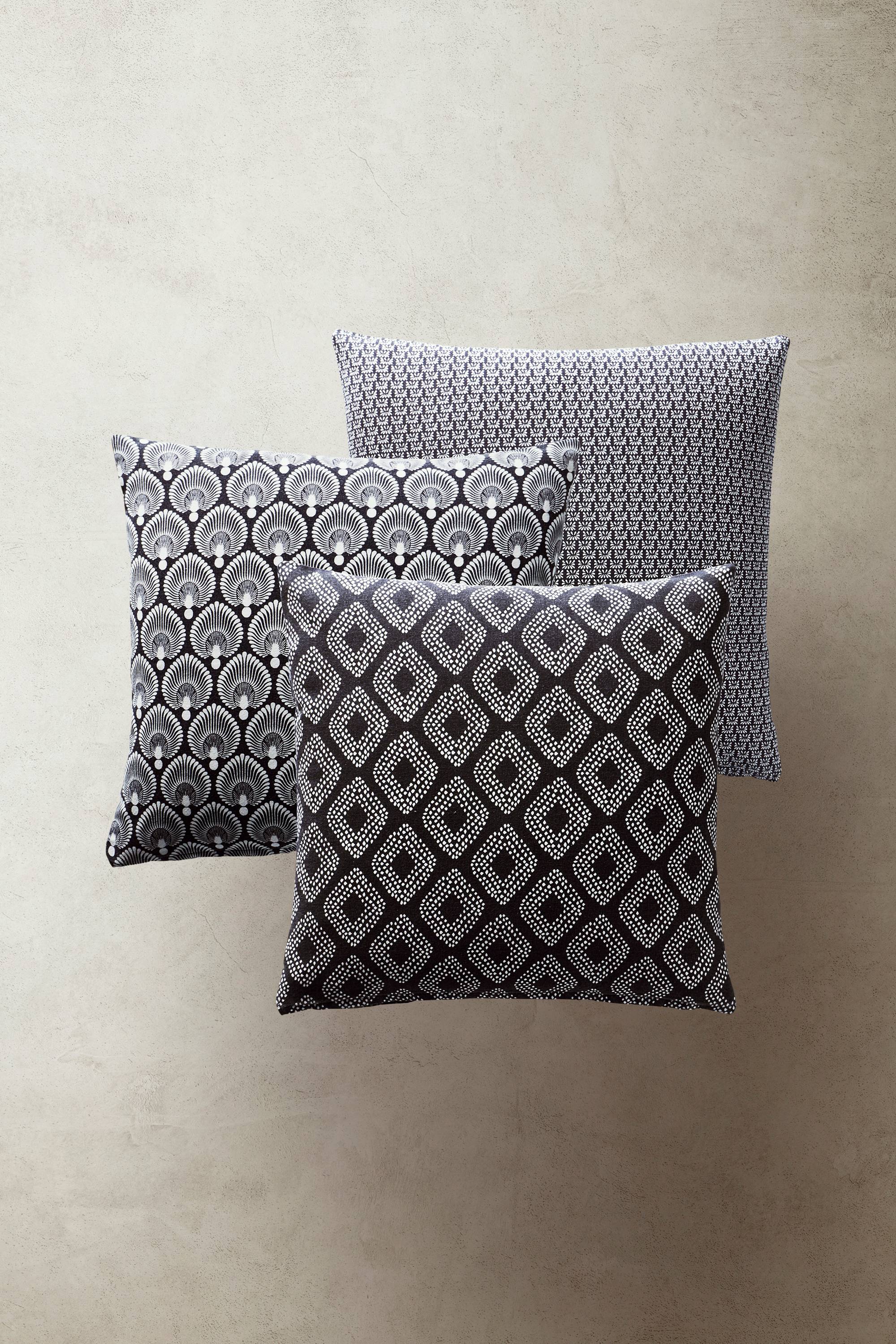 Pudebetræk i 3-pak. Af bomuld med printet mønster. Charmerende småmønstret med et skøn rustikt udtryk, som passer ind i mange stilarter. De tre pudebetræk har forskellige mønstre i hvid på farvet bund. Lynlås i kant forneden.