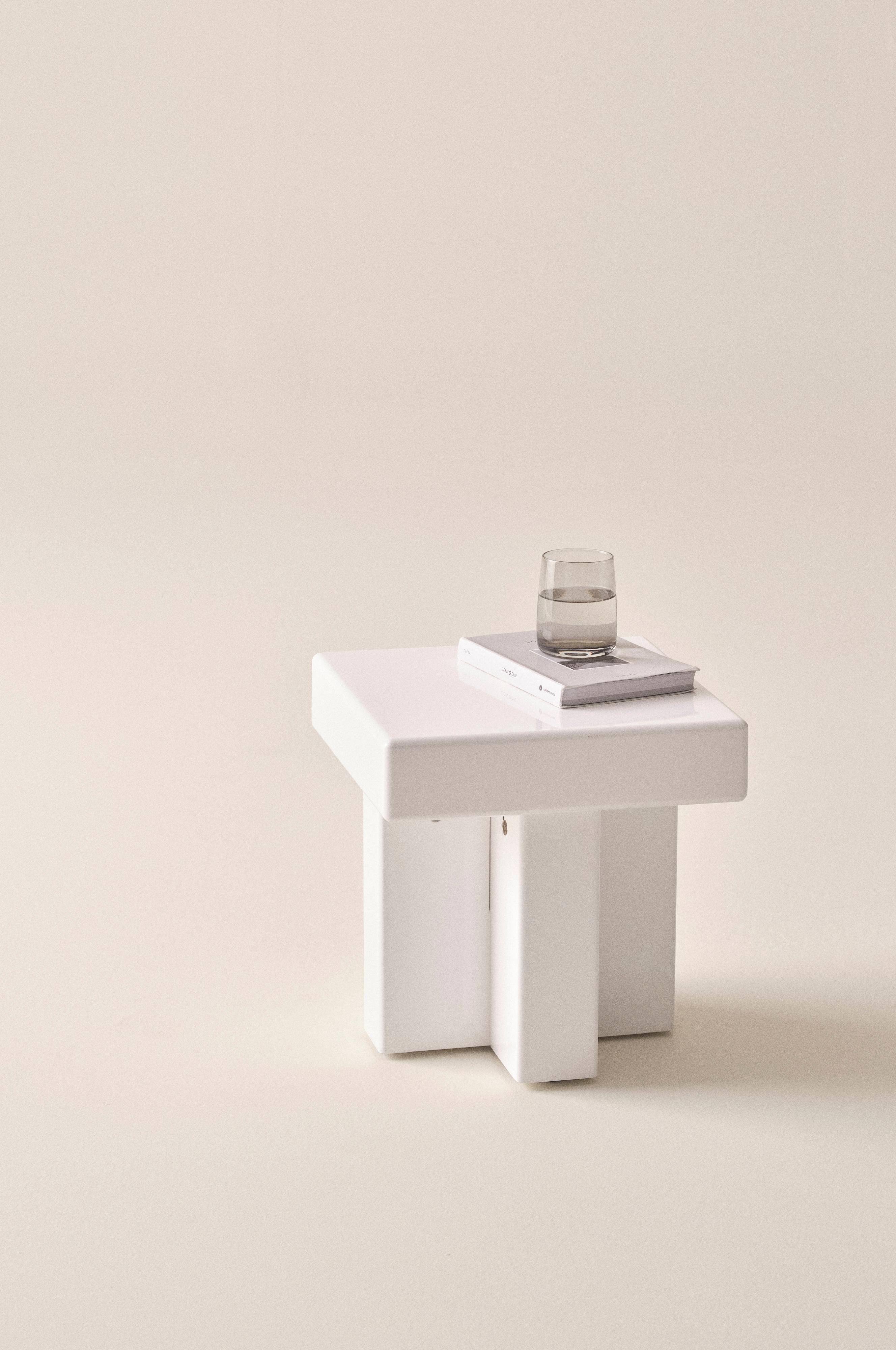Firkantet sidebord i kompakt og smart design, bordet er af MDF med højblank lak. Den kraftige og samtidigt lille bordplade hviler på et lige så kraftigt kors, som udgør benene. Små borde som dette er nemme at flytte efter dine behov, det er lille og praktisk at have ved siden af sofaen, og det bliver et livligt element som natbord ved siden af sengen. Skal færdigsamles. Samlevejledning medfølger.