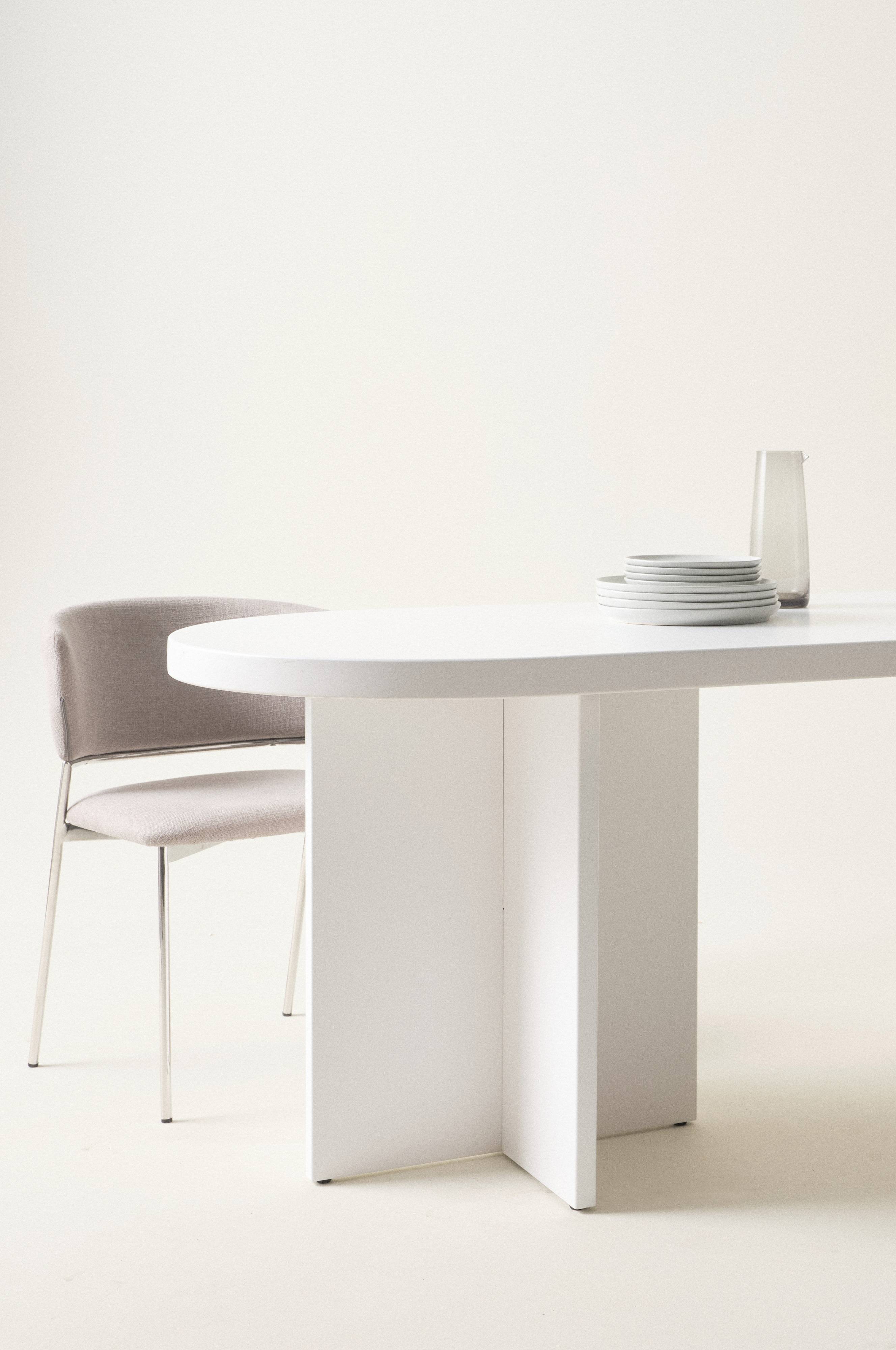 Ovalt bord af MDF som er pulverlakeret med vandbaseret lak. Bordets form er harmonisk, det smelter ind og har en blød fremtoning. De stabile ben i hver ende giver bordet karakter og benenes placering gør det behageligt at sidde ved bordet. Metalbeslag til montering af bordpladen medfølger. Nogen montering kræves. Samlevejledning medfølger.