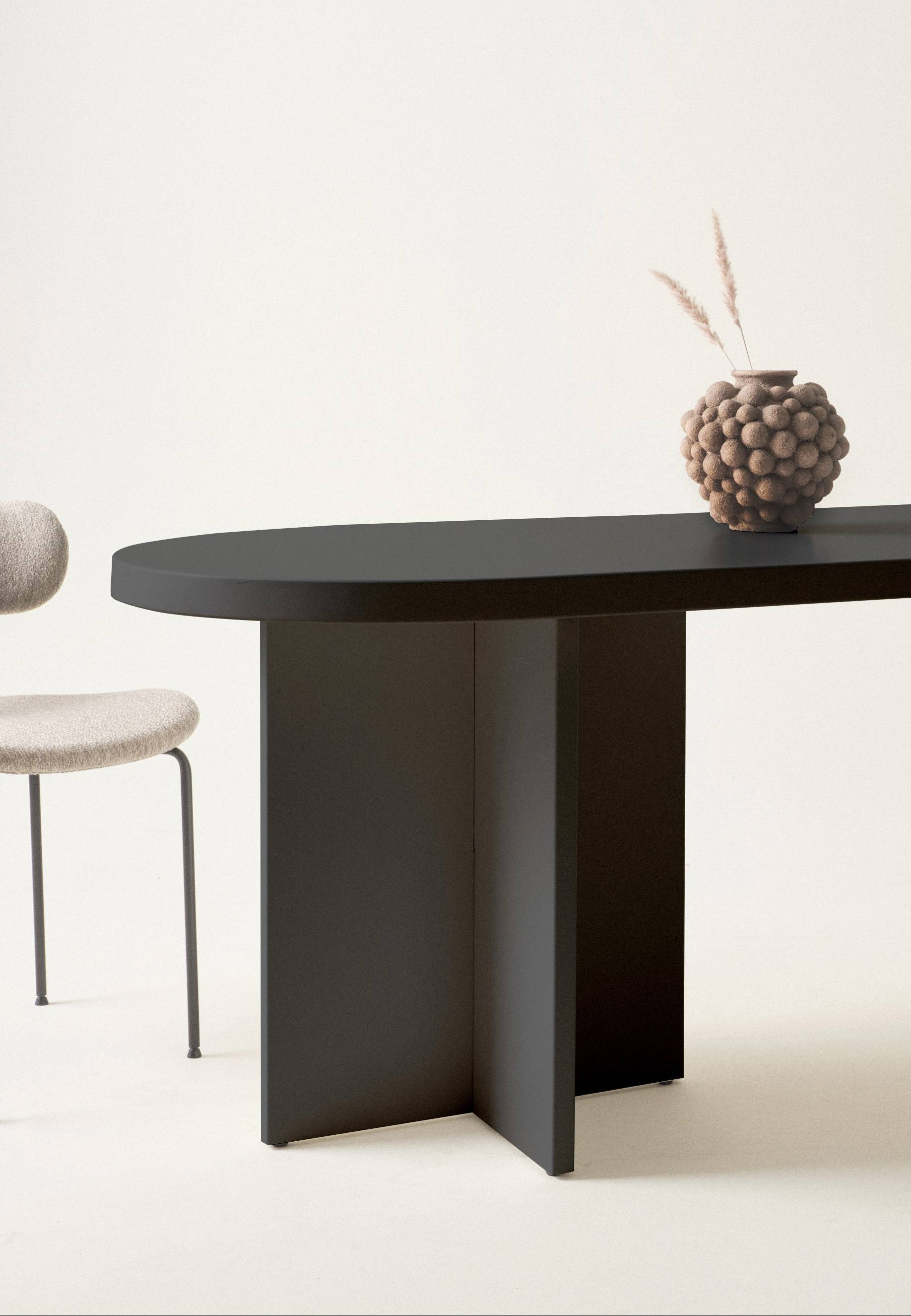 Ovalt bord af MDF som er pulverlakeret med vandbaseret lak. Bordets form er harmonisk, det smelter ind og har en blød fremtoning. De stabile ben i hver ende giver bordet karakter og benenes placering gør det behageligt at sidde ved bordet. Metalbeslag til montering af bordpladen medfølger. Nogen montering kræves. Samlevejledning medfølger.