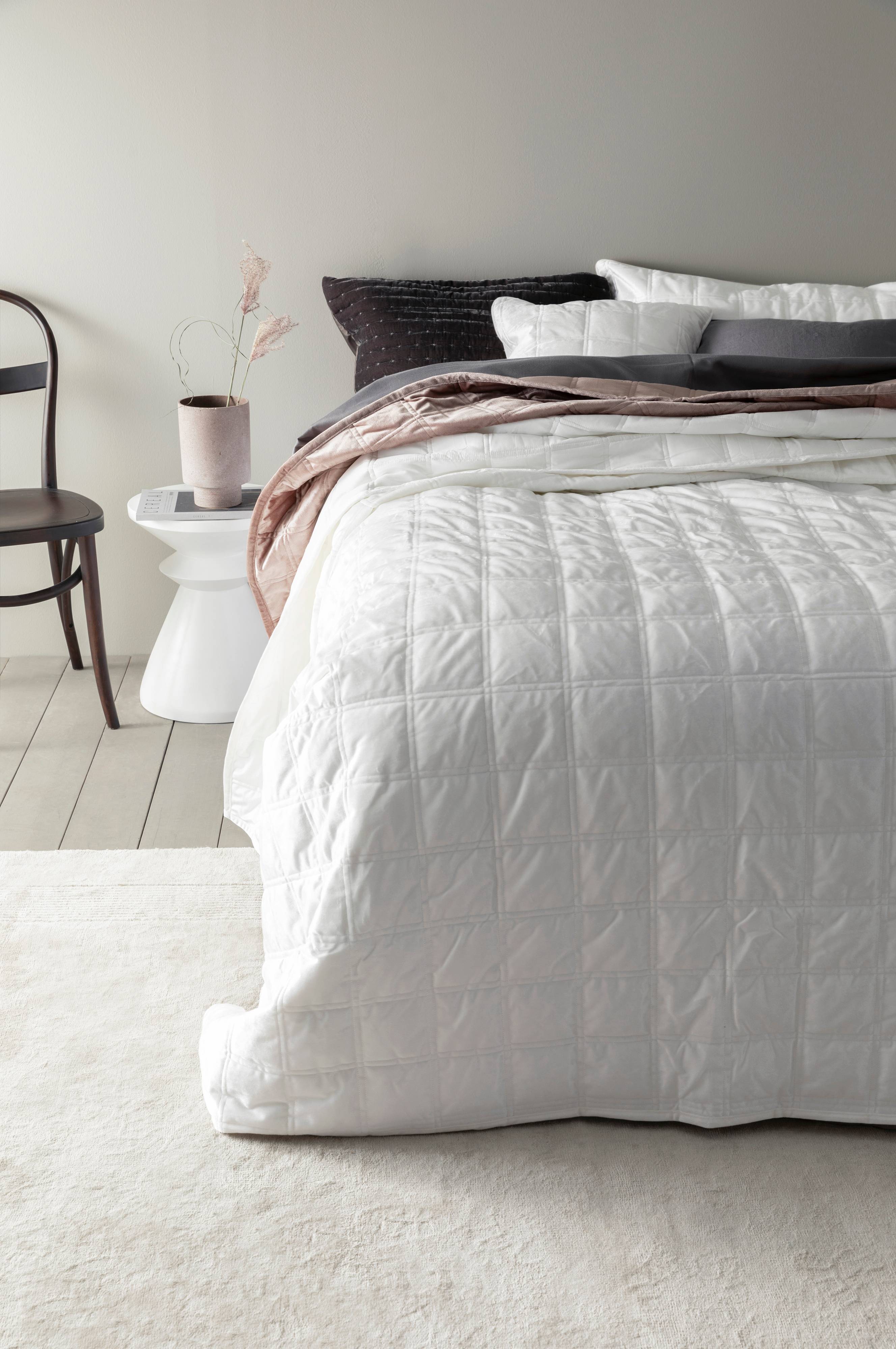 Sengetæppe til dobbeltseng. Sengetæppet er i quiltet velour med syede tern og matchende velourbagside. Pudebetræk medfølger ikke, købes separat.